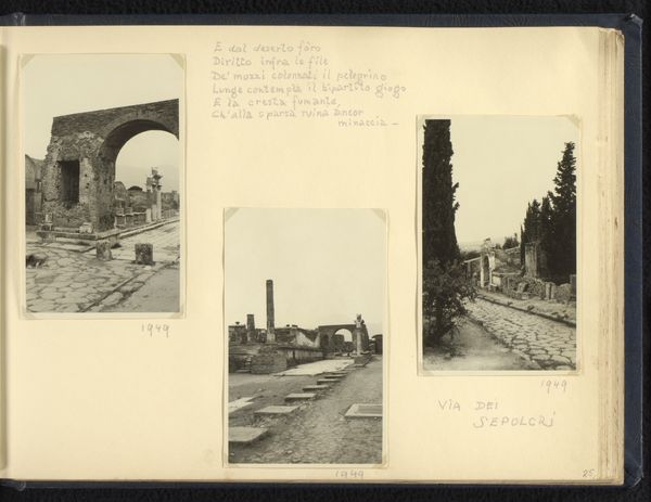 These four photographs of the Temple of Hera in Paestum were taken in 1950 by Norbert van den Berg. The monochrome image has a limited tonal range, but it's the composition that grabs me. Each photo offers a different perspective, almost like studies, with the light and shadow rendering the texture of the ancient stones. It’s almost like he's trying to capture the same subject from every angle. It makes me think about how we often try to understand something by looking at it from multiple perspectives. There's a documentary aspect, but the arrangement on the page adds a layer. It’s about the experience of seeing and remembering. Like Cy Twombly’s photos of ancient sites, these images embrace a sense of time and decay, and you feel the weight of history, but also the fragile nature of memory. The arrangement and handwriting has an almost personal quality, like a scrapbook. It's an ongoing conversation across time, inviting us to bring our own interpretations.