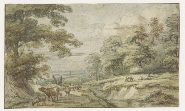 Editor: This is "Jacob wrestling with the angel" by Paul Bril, currently housed at the Städel Museum. It's done in watercolor and the scene feels almost dreamlike with the procession winding through the landscape and those two figures struggling in the lower right corner. How do you interpret the significance of these combined scenes, with this small intimate struggle taking place amidst the grand scope of a whole journey? Curator: This juxtaposition of scales and subjects is so interesting, isn’t it? It places the viewer in a position to think deeply about symbolism. Here, Jacob wrestles with an angel at the end of his journey back to Canaan, representing inner turmoil but also spiritual striving, the very human act of searching for meaning. But look around: this is but a piece in the complex tapestry of landscape, faith and fate that has been rendered here in watercolour, the most symbolic media of change. Bril invites us to reflect on the multifaceted journey of human existence and its continuous interaction with a divine narrative. The two narratives blend so gracefully that we begin to wonder which truly represents the 'foreground' of our understanding. What aspects resonate most with you? Editor: The landscape dominates, initially eclipsing the wrestling scene, making me think about perspective. Curator: Indeed, the dominance of the landscape isn't accidental. Remember, the cultural memory around this time strongly connects the natural world with divine presence. Jacob’s struggle isn't isolated; it unfolds within a spiritually charged environment. Bril is almost saying that spiritual transformation comes in conjunction with our engagement with the environment. Do you think this resonates with contemporary themes and interests? Editor: Absolutely, that connection between personal struggles and our engagement with nature is incredibly relevant. Curator: Indeed, this artwork serves as a timeless testament to our continuous search for our place in a wider setting of historical continuity and change. A landscape filled with the echoes of history, spirituality, and personal experience. Editor: I now understand that these watercolor figures aren't isolated entities but symbols intertwined, forever marked and impacted by their cultural landscapes. Thanks for enlightening me about Paul Bril’s artwork.