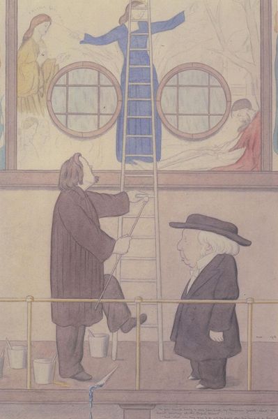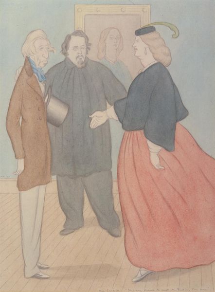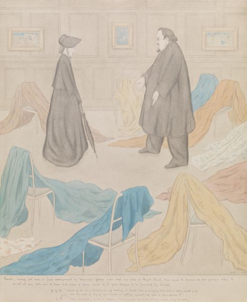 Curator: Sir Max Beerbohm, born in 1872, crafted this work, "Rossetti's Courtship." Currently held at the Tate, it presents a delicate scene rendered on a support measuring 324 by 210 millimeters. Editor: My first thought? Awkward! The composition feels deliberately tense. She's a pillar of blue, and he's all slouch and shadows. Curator: Absolutely. Beerbohm's known for his caricatures, and this seems to capture a strained dynamic, doesn't it? Rossetti, almost looming, while the figure, possibly Lizzie Siddal, stands rigidly. Editor: The scattered papers add to the chaos, a visual representation of unspoken anxieties. It's like a stage set for a drama about to unfold. Curator: Precisely. Beerbohm is using form to suggest the complexities of artistic relationships, the push and pull of ego and emotion. The space between them feels immense, almost theatrical. Editor: It's a curious piece, offering a wry commentary. I find myself strangely moved and amused at the same time.