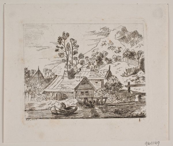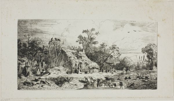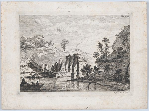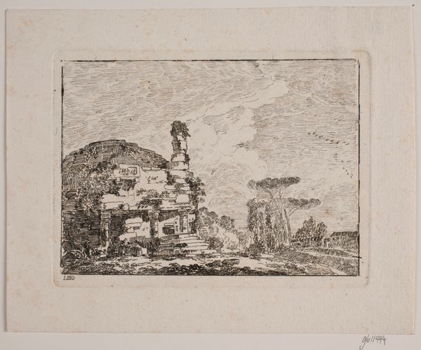 Jens Petersen Lund made this etching of ancient Roman ruins sometime in the late 18th century. The printmaking process is fascinating here. Lund would have used a sharp needle to draw directly into a copper plate, then bathed the plate in acid, which bites into the exposed lines. This is a relatively direct method, allowing for a spontaneous, sketch-like quality. Look closely, and you can see the network of fine lines creating a sense of depth and atmosphere. The etched lines have a delicacy, a fineness that’s quite different from a drawing made with pen and ink. The printmaking process inherently allows for multiples, connecting the artist to a wider audience through the circulation of images. This wasn't a unique artwork, but something available to a growing middle class interested in art and travel. Appreciating this print means understanding the craft and industrial processes that made it possible.