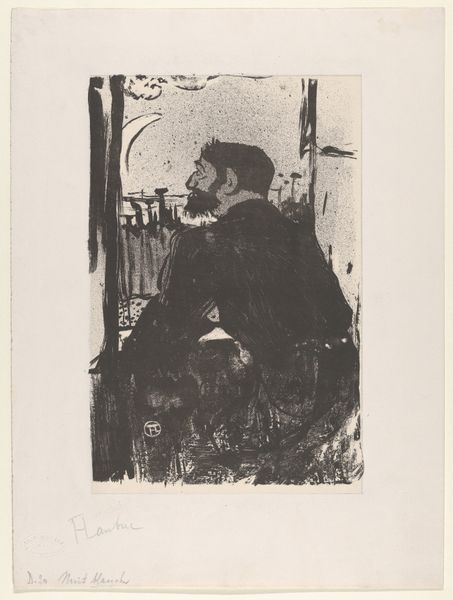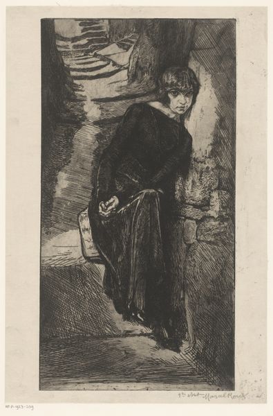 Curator: What strikes me immediately is the sense of quiet contemplation emanating from this image. There's a world-weariness, perhaps? Editor: It's evocative, definitely. This print, an etching actually, titled "Russische man met wandelstok en Moskou op de achtergrond"—"Russian man with walking stick and Moscow in the background"—was created by Louis van Engelen, sometime between 1866 and 1910. Curator: The figure is certainly dominant, almost monumental despite the medium being a print. The fur hat and coat—the textures rendered with such care. One wonders about his relationship to the city in the background. Editor: Right. Who is this man and what's his connection to Moscow? There's an implication here, this gaze upon the city...is it longing, resentment, belonging? Class dynamics perhaps? His clothing suggests a certain status, but it also hints at someone accustomed to the harsh realities of the Russian climate, of Russian society. Curator: Indeed. He’s positioned, framed even, looking out onto the city as if surveying his domain... or, conversely, kept outside its walls. We interpret such potent iconography based on our internal landscapes as much as the cultural signifiers. Editor: The backdrop—Moscow— is rendered almost dreamlike, hazy, which contrasts with the sharper details of the man. The city is there but out of reach. The walking stick might symbolize a journey or his state of mobility at this stage of life. The realism speaks volumes, yet also, intentionally, leaves much unsaid about that socio-economic and political milieu. Curator: Absolutely. The artist clearly understood the symbolic weight of rendering Moscow this way. The cityscape itself almost becomes a character, bearing silent witness. And this technique—etching— the act of physically engraving this man and the city, further imbues it with this… permanence, you might say. The fur hat is like a marker as much of identity as class. Editor: Precisely. What Engelen gives us here is a study of contrasts. Between the individual and the collective, the personal and the political, absence and presence, permanence and ephemerality. These dialogues, they challenge the simplicity that sometimes cloaks the past, as much as inform. Curator: A layered cultural artefact indeed, inviting endless interpretations through symbols which are ultimately familiar. I appreciate how the artist doesn't dictate one reading; this quietly offers room for introspective engagement.