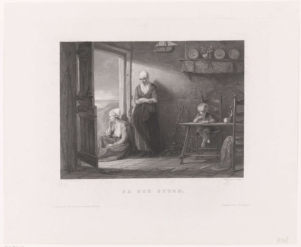 This print by Hendrik Sluyter depicts a mother and her two children awaiting a loved one’s return. The open doorway, a dominant visual symbol, frames a distant seascape. This motif, the threshold, appears throughout art history representing both departure and return, hope and anxiety. Consider the Roman god Janus, guardian of doorways, embodying transitions. Here, the doorway signifies not just a physical opening, but a psychological space charged with anticipation. The mother’s stoic stance, arms crossed, echoes the timeless pose of watchful figures in countless Renaissance depictions of the Annunciation, suggesting a vigil. The interior is dark and oppressive, full of the quiet anxiety of waiting; this evokes a powerful emotional state, engaging viewers on a subconscious level. This symbol has been passed down through history, evolving from religious contexts to secular scenes of domestic life, shifting in meaning yet retaining its emotional power. The door remains a poignant symbol, resurfacing and evolving across time.