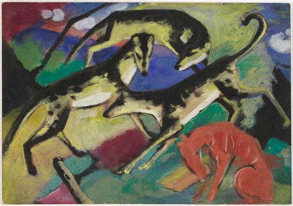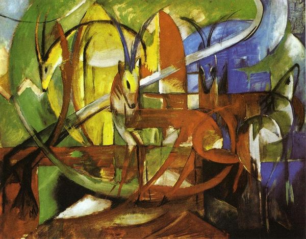 Editor: Here we have Franz Marc's "Two Cats, Blue and Yellow" from 1912, currently residing in the Kunstmuseum Basel. It certainly presents an interesting use of color to depict, well, two cats. The blue one appears to be stretching, while the yellow one is reclining above. What strikes you when you view this painting? Curator: I am struck by the deliberate distortion of form. The cats are not rendered realistically, but rather through a series of flattened planes and intersecting lines. This abstraction serves to disrupt our conventional understanding of the subject. Consider the unnaturalistic use of color – the vibrant blue and yellow are not descriptive of the animals' actual coloration, but serve instead as autonomous elements within the composition. Editor: So, the color isn’t about describing the cats but is functioning on its own? Curator: Precisely. The composition itself operates on a sophisticated interplay between foreground and background, figure and ground. The shapes interlock in such a way that the cats almost dissolve into their surroundings. How does the arrangement of these shapes influence your reading of the piece? Editor: It makes me feel a little disoriented, honestly. Like the cats and the world around them are all part of the same fragmented reality. Curator: Exactly. This fracturing reflects Marc's broader interest in disrupting established modes of perception. The painting engages in a discourse about representation itself, calling into question the assumed transparency of pictorial language. The semiotic density rewards sustained visual investigation, pushing beyond superficial readings. Editor: It’s interesting how much you can say about the painting simply by observing its formal qualities. I think I understand Marc's exploration a bit better now. Curator: Indeed. By carefully attending to the structural elements of the work, we can begin to unravel the complexities of its meaning. It moves beyond simple representation into a realm of pure visual experience.
