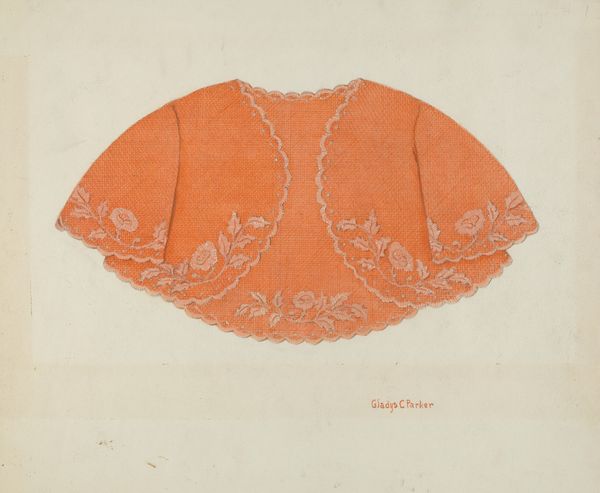 Curator: This simple kerchief depicted in watercolour and pencil seems so unassuming at first glance. It is rendered so softly! Editor: And so tenderly, like a shy, whispered memory. It is Helen E. Gilman’s, titled "Shaker Kerchief," and dates from around 1936. Beyond the domestic, though, it represents resilience, the dignity of everyday labor, the artistry woven into a community defined by devotion, pacifism, and self-sufficiency, so don't be fooled! Curator: Well, the quietness is what I noticed first. The subtle blending of the mauves and blues and the gentle way the light rests on the fabric; it feels meditative. It almost invites you into a world governed by simpler virtues. Editor: Exactly. This isn’t merely a representation of a garment; it encapsulates the material culture of the Shakers, those remarkable 18th-century religious refugees whose social revolution demanded equality across gender, and even race, and the creation of utopian societies that pushed against norms of ownership. What do you think the colour symbolism represents? Curator: Perhaps the soft color palette speaks to their humble lifestyle? There is also a sense of worn familiarity. The kerchief shows how beauty can be discovered in the quotidian. Is there an overt symbolism or more of an intuitive feeling, you know? The soft rendering makes me imagine the cool press of it on my skin. I love to meditate on colour. Editor: The absence of figures underscores the importance of community and the shared values they lived. Gilman may be encouraging a radical act of viewing; inviting us to see not just with our eyes but through a lens of ethical consciousness! I would call it domestic space as an activism! Curator: I see it more as celebrating stillness and solitude and allowing that object to almost become its own symbol for an entire system of beliefs. But in that moment, one just appreciates its intrinsic beauty, forgetting, even, that context. It is nice to contemplate both ways though! Editor: Yes. Gilman uses accessible aesthetics to highlight histories of marginalized groups that were, at their core, attempting radical restructuring, she reminds us of both art and radical agency. Curator: Leaving me wondering about beauty in quiet protest and those whispers that rise through us from inanimate things.