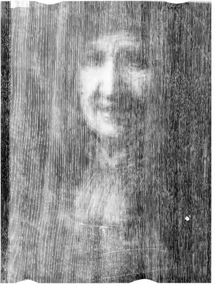 Curator: This is an X-radiograph of Rembrandt van Rijn’s "Self-Portrait," part of the collection here at the Harvard Art Museums. It’s a film, about 14 by 17 inches. Editor: Wow, it looks like a ghost. All these layers and textures, it makes me think about what's hidden beneath the surface, not just in art, but in ourselves. Curator: Exactly. X-radiography allows us to see the underpainting, the artist's process, the choices made and then painted over, and sometimes even previous compositions. It gives us a glimpse into the artistic process. Editor: It's like archaeology of the self. Peeling back the layers of identity that Rembrandt constructed, and maybe even questioning them. I am left wondering, what parts of ourselves do we hide, even from ourselves? Curator: A valid question. Art history allows us to examine artistic practice within social context. Editor: Absolutely, and it shows how vulnerable Rembrandt must have been to present even a glimpse of his raw self. Curator: Yes, and this technology adds a new level to the story of representation and identity. Editor: I find it moving how technology helps us to connect more to the artist, like finally hearing a whisper from the past.
