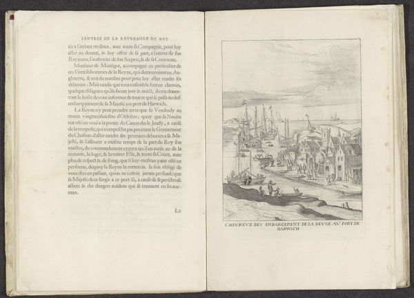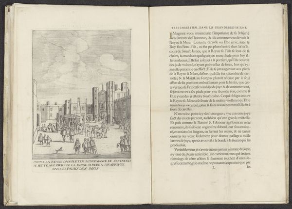 Editor: Here's an intriguing image titled "Arrival of Maria de' Medici in the City of Colchester," dating back to 1639. It seems to be a print, maybe an engraving. There is a real feeling of pageantry, you know, ceremony. What strikes you most when you look at this? Curator: What immediately captures my attention are the visual symbols encoding power, Editor. Notice how the architectural features, like the city gates, become performative stages for demonstrating allegiance. It's more than just depicting an event; it's about staging a visual narrative of cultural memory. Editor: Cultural memory? Can you elaborate on that? Curator: Absolutely! Consider the procession itself. Parades like these create symbolic links to the past while shaping future expectations. Think of it: who gets represented? How are they positioned relative to the Queen? These details communicate unspoken values. Even the cannons fired during such parades carried historical symbolism. Editor: So it's less about historical accuracy and more about creating a particular cultural narrative? Curator: Precisely! And the fact that this moment was captured as a print meant this staged narrative could be reproduced and disseminated widely, further solidifying that memory and shaping public opinion. Look at the mirroring of text and image – how do you interpret this layout decision? Editor: I hadn’t considered the text… It's fascinating how symbols, like architecture, fashion and procession, carry complex social and psychological meanings that might be different from a simple illustration. Thanks for making me see that. Curator: Indeed. And in deciphering those layered symbols, we glimpse into the minds and memories of a society long past.