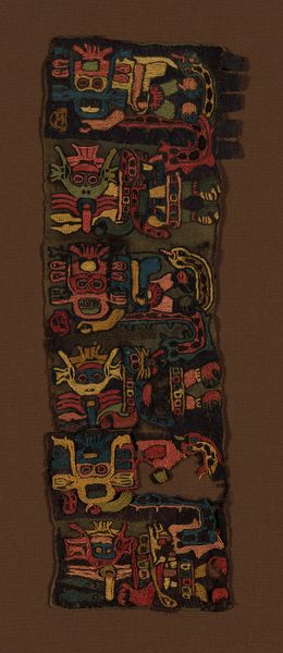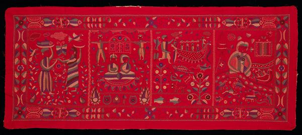 Curator: This intriguing print before us is John Livingston Ihle’s “Animal Kingdom,” created in 1958. Ihle uses techniques like etching, aquatint, and engraving. It is incredible how these various processes of printmaking have converged here. Editor: The immediate impression is…primitive. It's incredibly layered. It feels as though I'm observing a very old archaeological site that exposes distinct levels or perhaps cultures, all at once. The color is of aged patina. Curator: Ihle was very interested in the intersection between indigenous cultures and modernist styles, wasn't he? Look at how those stylized animals and figures almost recall Northwest Coast art while also speaking to a broader mid-century aesthetic. His work reflects a deep engagement with pre-Columbian art history and cultural memory. Editor: And observe the process! These intricate lines, rendered using labor-intensive etching, aquatint and engraving techniques, clearly evidence Ihle's masterful craft. This wasn’t quickly done; the hand and the method were intensely involved. We see his deep labor etched into the printing plate to then be etched onto the paper! Curator: Absolutely. And I find myself wondering about the consumption of images like these during the 50s. Who was the intended audience? How did Cold War politics affect the reception of a work drawing from, and seemingly celebrating, Indigenous aesthetics? Editor: Right! You can almost feel the intense manual work embedded within its construction, pushing against mass-produced imagery during the time it was created. This evokes ancient creation but simultaneously offers social commentary for contemporary life in mid-century America. Curator: Seeing this piece in the museum collection allows us to appreciate the artist's vision while encouraging viewers to understand our connections with cultures. We must always be aware of the public and the place of art. Editor: Well said. It's amazing how exploring a seemingly "primitive" method encourages modern conversations about both the processes of labor and visual meaning.