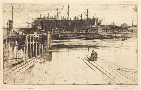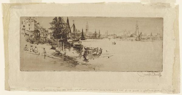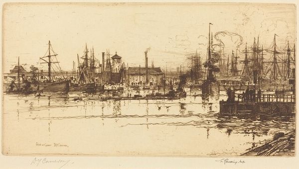 Curator: I'm struck by the energy here. There's a real sense of industry; even though it's rendered in etching, it feels dynamic, bustling. The masts create this spiky silhouette against a somewhat gloomy sky. Editor: Indeed. The work before us is "Glasgow Harbor," an etching by David Young Cameron from 1889. To truly appreciate this image, we must understand the context of Glasgow at that time, a major industrial center of the British Empire. This piece visually encapsulates that era, highlighting labor, trade, and the very architecture of capitalism. Curator: You can certainly feel that pulse in the lines of the ships and buildings. The detail is intriguing—little clusters of people going about their work along the docks. To me, the boats feel less like symbols of commerce and more like skeletal, cage-like structures dominating the harbor. What can we glean from these ships? Editor: Well, ships are complex cultural symbols. They represent both connection and separation—carrying people, goods, and ideas, but also serving as a physical barrier between lands. The multitude of masts could reflect Glasgow’s status as a gateway but also serve as a somber reminder of the exploitative underpinnings of such booming industries. Think of all that transpired on waters across the centuries, good and evil. Curator: Looking at the crowd on the pier, they could be anyone from dockworkers to recent immigrants seeking new beginnings, all tied together by shared geographical circumstances and economic pressures. Editor: Right. Moreover, the etching process itself speaks volumes. Etching's reliance on acid suggests transformation. To what extent do you think Cameron captures a moment of industrial flux and reflects a cultural unease that may have emerged during a period of so-called progress? Curator: Perhaps he's capturing a kind of uneasy dance between the grand promises of industry and the grittier reality experienced on the ground. The sky, subtly etched, hints at a feeling that prosperity might come at the cost of something intangible—like a collective identity or value. Editor: Ultimately, what began for me as a somewhat bleak depiction of labor has deepened into a layered narrative that offers a powerful and nuanced perspective on industrial expansion and society. Curator: I'll leave contemplating the individuals in the crowd—how might they view themselves within the immensity of ships and trade that are etched into this single picture?