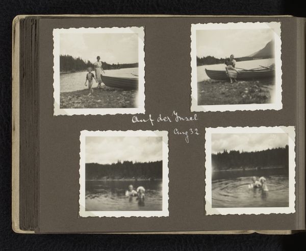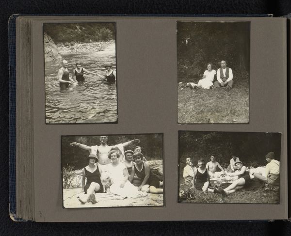 Curator: This page, potentially dated between 1944 and 1949, titled "Utrecht," features three gelatin-silver print photographs arranged on what appears to be a scrapbook page. The artist is anonymous. Editor: It evokes such a quiet mood, almost melancholy. The monochromatic tones, combined with those delicate, almost hand-torn edges of each print, really give it an intimate, nostalgic feel. It’s a visual whisper. Curator: The landscapes and posed portraiture each possess a subtle narrative weight. Landscapes, in art and life, become symbols of journeys. Here, we see that fence almost trapping or restricting access to it. This invokes cultural memory around accessibility, or the lack thereof, perhaps to recreation in public spaces. Editor: Absolutely. When you view it through the lens of postwar realities and gender expectations, it does start to feel very different. I think this piece opens conversations about women's roles, public spaces, and photography’s ability to preserve those layered narratives. Who got to sit and read peacefully in the park, and who didn't? Who had the leisure, and who faced other pressing demands? Curator: I agree. In the central image, the figure is absorbed in her book, shielded by a fortress of leather and ink. The park then transforms into a library or haven, rich with possibilities. Perhaps reading itself becomes the key that unlocks symbolic barriers in those landscapes. Editor: And notice the placement, how that central figure feels positioned like a fulcrum point, as the keystone balancing landscape views. The arrangement of photos becomes very significant when interpreting identity as mediated in both public and private life. Curator: Well, by recontextualizing an artifact—a gelatin-silver print, no less—we transform it into something other than mere photograph. Editor: In essence, each silver halide crystal transforms into a new reflective shard on memory. I am glad we paused to reflect here today.