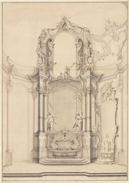 Curator: Let’s take a look at this intriguing drawing, "Design for a Chimney Piece with a Mirror and Two Seated Figures with Candelabra" by Jean Berain, dating back to around 1700-1705. It's currently held at the Rijksmuseum. What strikes you about it initially? Editor: Immediately, I see opulence rendered with delicate materials. It looks like graphite or black chalk on paper; this precise medium feels at odds with the grandeur of the design, focusing on production, draftsmanship, and planning over precious materials like marble or gold. Curator: Exactly, Berain was renowned for his Baroque style, heavy on symbolism and the glorification of power. Consider how the seated figures holding candelabras act as caryatids, supporting the weight of the entire structure visually. It evokes themes of strength, duty, and illumination. Editor: I’m more interested in what this suggests about class and consumption. Chimneys like this were markers of wealth; imagine the number of people involved in sourcing the materials, carving the ornaments, and installing this piece. Each angel, wreath, and sconce implicates layers of human labor and global networks of resource extraction. Curator: But look at the circular portrait at the top. Placed centrally like an all-seeing eye or deity. Wouldn't you agree that this imagery carries psychological significance and speaks to self-regard within a domestic space? Editor: Sure, the circular form resembles currency – minted to affirm power. Everything in this sketch served some utility: for impressing guests and accruing cultural capital, or even just warming up a chilly room. I’m interested in what Baroque homes might have excluded and what populations of servants or factory-workers labored unseen in cold shops while these fireplaces took form. Curator: I understand your points regarding labor. However, for me, the careful placement of symbolic elements—the crown above, the angels playing trumpets—they transform a mere chimney piece into a pronouncement of authority and divine right. Editor: We agree it is an object loaded with intention, from its materiality to its impact! Curator: Indeed! Seeing how cultural values manifest even in something as seemingly simple as interior decoration helps bridge history and modern life. Editor: Agreed! We must consider these design choices alongside production when understanding our inherited present.