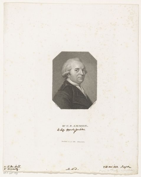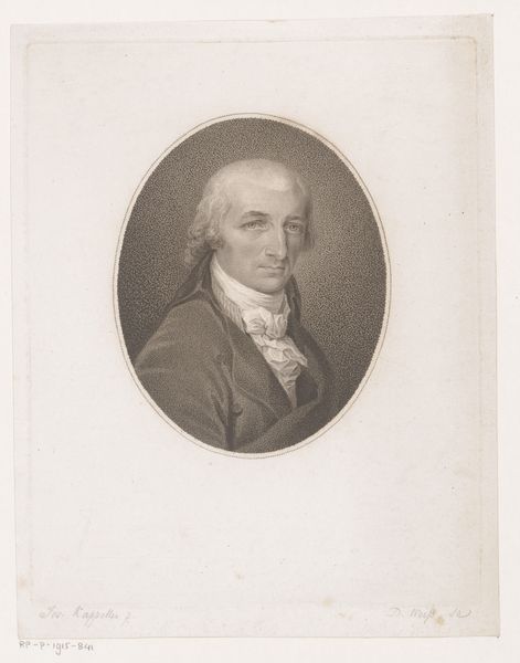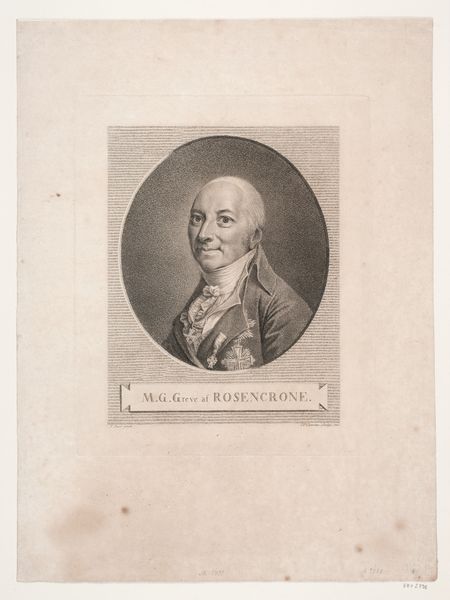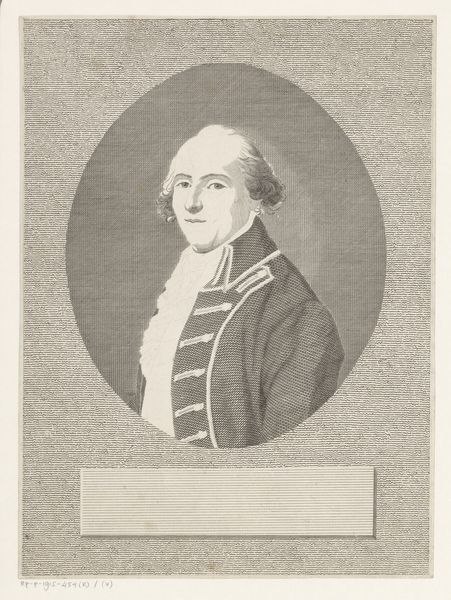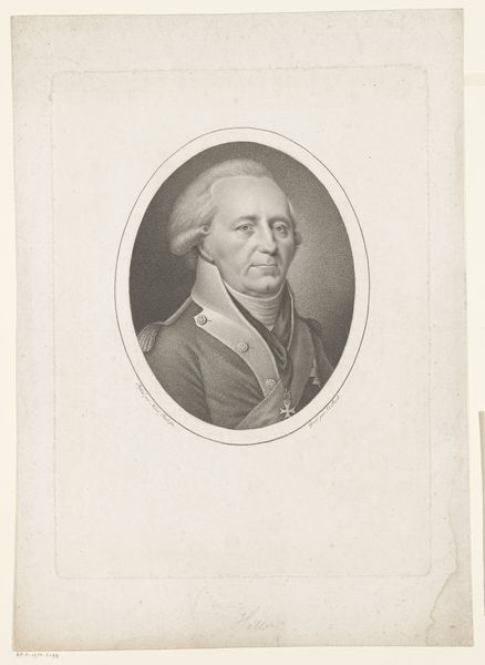 Curator: The piece before us is a late 18th-century portrait—more precisely, an engraving by Gilles Louis Chrétien, titled "Portrait of a man in uniform to right," placing it somewhere between 1786 and 1799. It exemplifies the Neoclassical style so prevalent at the time. Editor: It's austere, isn't it? That sharp profile cut against the stark white, almost… Roman in its severity. Gives me the shivers, thinking about powdered wigs and revolutions. There's a crispness in the line that feels very detached. Curator: Absolutely. Chrétien was actually quite the innovator, pioneering a mechanical engraving technique called the physionotrace, which allowed for accurate and reproducible portraits. This was significant in democratizing access to portraiture. It created multiple portraits to be distributed among networks, social circles. Editor: Ah, so it's the 18th-century equivalent of the selfie! Makes me wonder who this man in uniform was, and who might have received copies of this portrait. Did it serve some specific purpose for him? His clothing seems important. Curator: The uniform signifies his belonging to a particular regiment, an elite class. These portraits weren't just about likeness; they were about status, about cementing one's place within the social hierarchy. Chrétien's clients often included members of the aristocracy, military figures, or notable bourgeois. Editor: So, image as power… it tracks! I wonder, looking at it closely, if the accuracy granted by this new machine also unintentionally strips away some of the soul. It is accurate, sure, but a little… empty? It almost seems too literal. No poetry! Curator: I see your point. Perhaps the technical precision prioritized the factual over the emotive, reflecting the Enlightenment's emphasis on reason and empiricism. The revolution then turned the public's access to reproducible portraiture, which had mostly included the noble, into an emblem of propaganda. Editor: Yes! Despite, or perhaps because of the lack of personal feeling, the print encapsulates this important moment of time. Thank you for bringing this history to light! Curator: My pleasure. It is a small picture with echoes of revolution, isn't it?