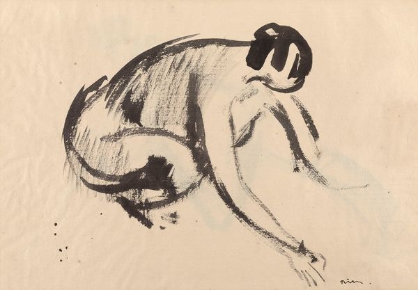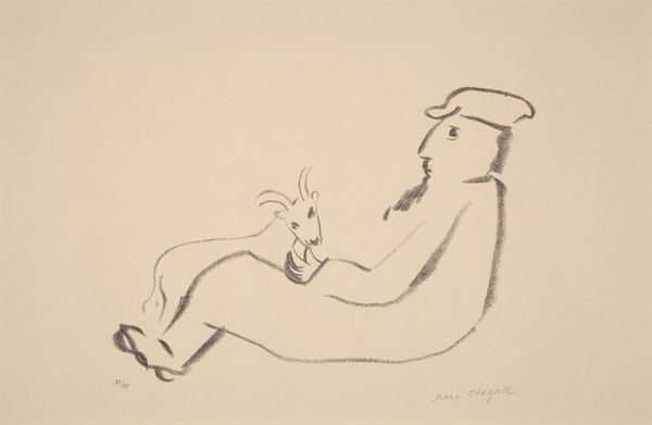 Curator: Welcome. Before us is Marc Chagall's "Boots," a drawing made sometime between 1922 and 1923. It appears to be graphite, perhaps with some ink detailing. Editor: It’s stark. Bleak, even. The limited palette emphasizes the disjointed nature of the figure, with that absurd bend at the torso. It has an unsettling feeling. Curator: Precisely. Notice how Chagall utilizes cubist strategies of fragmentation, particularly in the rendering of the head and torso. The implied lines create shifting planes of vision, complicating our understanding of the subject. Editor: The boots anchor it all though, don’t they? They're rendered with much heavier lines than anything else, making them the material base of this fractured existence. It speaks to the labor and grounding influence boots could have in that period. Curator: Indeed. They serve as a visual anchor and create a weighty foundation for the more ephemeral, floating elements of the figure, like the pointing hand. It's almost an exercise in surrealist figuration, bending space and perspective to hint at deeper psychic realities. Editor: But look at the table – a carefully delineated object set off at a curious angle with an object on it perhaps representing a filleted fish? Is this table a place of refuge, or further surreal juxtaposition? Is this pointing man bringing fish, or being driven away? Curator: Consider the artist's biography: these works were created around the time of his return to and permanent departure from Russia after the October Revolution, marked by loss and dispossession. "Boots," with its stark contrasts and precarious composition, could reflect Chagall's experience of a world turned upside down, or even the plight of Jewish communities across Eastern Europe at that time. Editor: That biographical context illuminates the figure's contorted posture – perhaps suggesting someone physically weighed down by circumstance but, it still doesn’t quite communicate all the layers the fish alludes to. Curator: Thank you. Through formal analysis, contextualization, and close attention to Chagall's distinctive approach, we start to grasp something about this compelling visual document and its historical moment. Editor: This piece makes me appreciate the role of rudimentary material objects within personal and societal narratives and that materiality isn’t so ‘simple’. Thanks.