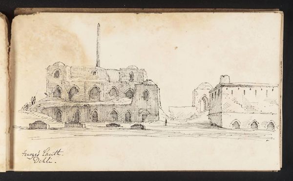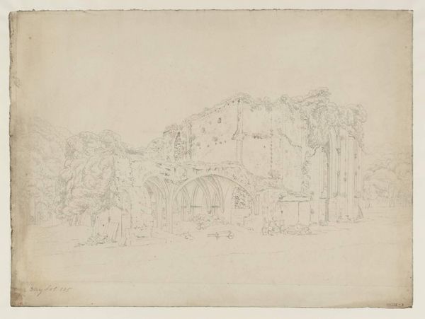Curator: This is William Marlow's pencil sketch, "Baths of Diocletian, Rome." Though undated, Marlow was actively sketching scenes like this in Italy in the 1760s. Editor: There's a real sense of desolation here. These grand ruins are rendered in such delicate, almost mournful lines. You can practically feel the weight of history. Curator: Indeed. Consider the cultural weight of these baths. They were once a symbol of Roman power and leisure, now sketched as a ruin, a testament to the passage of time. Editor: It makes you wonder about the politics of ruin, doesn't it? Marlow’s choice to depict it so starkly suggests a commentary on the impermanence of even the mightiest empires. Curator: And the symbolic resonance of water, once a source of purification and social gathering, now overtaken by decay. The image seems to ask: what remains of a civilization's rituals? Editor: Ultimately, it feels like a meditation on cultural memory, and how these skeletal remains continue to echo through the centuries. Curator: A poignant reminder of the cyclical nature of history, indeed.