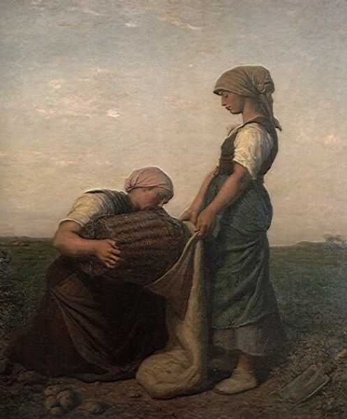 Curator: Here we have Jules Breton’s “Evening,” created in 1860. It resides here, in the Musee d'Orsay, and showcases Breton’s masterful ability to capture the beauty and solemnity of rural life. Editor: I'm struck by the somber mood of this work, a sort of hushed resignation. The colors feel like twilight, a melancholic memory rendered in paint. I can almost smell the dust from the fields and feel the hard-packed earth beneath bare feet. Curator: Breton belonged to a lineage of painters committed to portraying peasant life with a heightened sense of dignity. What seems initially sentimental has social and political implications for the art's accessibility to a growing public audience and those peasant communities represented. Editor: Dignity, yes, but also fatigue, a weighty weariness. Her slumped posture, the way her gaze drifts downwards... It speaks of a life tethered to the land, to endless labor under an endless sky. Do you think he was at all conscious of that inherent paradox of his situation as a bourgeoise male artist representing rural female realities? Curator: I’d wager that, as part of the artistic milieu that defined French Realism, that inherent paradox was not lost on Breton, and many artists of his ilk who grappled with depicting the peasantry. Though his brand of Realism, unlike that of Courbet, certainly softens the harsher aspects of that labor to provide a more palatable image to potential art buyers. Editor: True, there's an idealized serenity that softens the blow of reality, doesn't there? But is there beauty in the grit? Her strong hands, calloused maybe, and the sun-kissed weariness etched onto her face. The gold hue on the back crops reminds me that despite what, her home exists at the end of the day. Curator: I concur. The formal handling of light contributes much to Breton's reputation as a vital and sensitive genre painter during the late 19th century in France. While it sentimentalizes labor to an extent, its accessible presentation spoke directly to the increasing social importance of paintings shown at the Salon, influencing what public art could do. Editor: For me, the success lies in Breton's portrayal of humanity facing universal, human, struggles with something noble. Curator: Perhaps "Evening" is, at its heart, a monument to the endurance and quiet fortitude of the human spirit under even harsh conditions. Thank you for your comments, and feel free to discover more perspectives within the museum's wide collection.