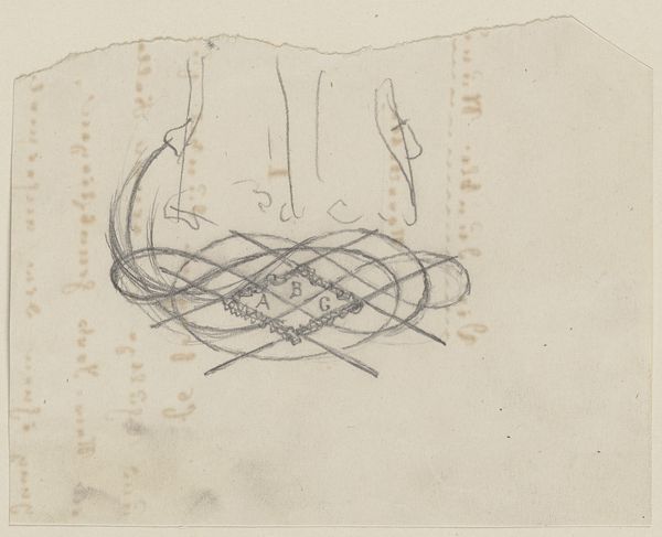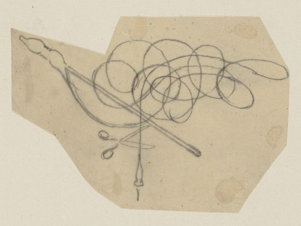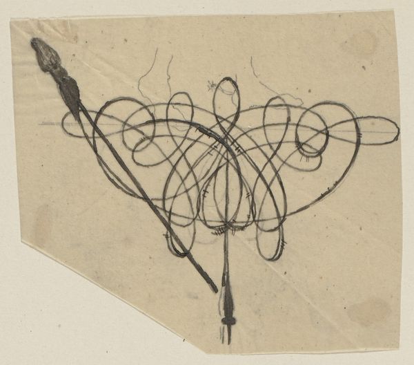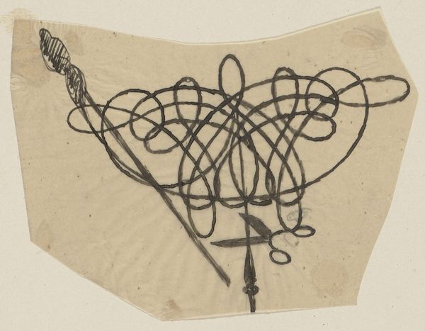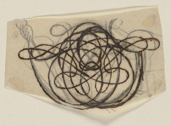 Curator: Ah, here we have Paul Konewka’s “Ornament des Nick Bottom als Pyramus mit Garnspule,” crafted circa 1867-1868. It's a striking example of his ink and pencil drawings. Editor: It's... chaotic. Like a tumbleweed made of cursive. I can see a single, bold stem with what looks like the hint of a bud on the left, yet its starkness accentuates the interwoven circles occupying most of the pictorial field. What is that tangle? Curator: Well, Konewka was fascinated by silhouettes and often depicted literary characters, placing them in detailed societal settings. In this piece, he presents Nick Bottom, the weaver from Shakespeare’s “A Midsummer Night’s Dream,” reimagined as Pyramus, but rendered as a purely ornamental design. Think about the socio-cultural influences of the time—the Romantic era’s penchant for folklore blending into the more rigid Victorian structure, perhaps offering critique through whimsical imagery. Editor: Yes, Romanticism and its stylistic impact come immediately to mind. The use of line is rather captivating. The loops—deliberately uneven, as if spontaneously generated—show a fascinating manipulation of visual weight, establishing the mood, the dynamism of Romantic art that valued sentiment above meticulous representation. Curator: Exactly. The "Garnspule," the yarn spool, suggests industry and perhaps a slight mocking commentary of the bourgeoisie, framing a working-class figure within refined ornamental calligraphy. It touches on how societal roles become intertwined with performance and expectations. Consider its display here in the Städel Museum— it creates its own dialogue about high and low art forms within institutions. Editor: You know, the way the ink bleeds slightly into the paper only strengthens the drawing's emotive character. This wasn’t about technical exactitude, the appeal lies precisely in its imperfection. In a purely formal sense, those tonal shifts really work to make it pop. Curator: Indeed. Its seeming messiness also echoes Bottom's own confusion in the play, and also reminds us of how working classes were starting to define cultural narratives. Even the materials—humble ink and pencil—reflect accessibility and everyday life, brought into what could be considered “high art”. Editor: Seeing it from both angles truly transforms the experience. The visual dance of line and curve really elevates its playful simplicity. It has a subtle brilliance about it. Curator: And understanding its role within the narrative of the era certainly enriches the experience, giving depth to this unusual artifact of theatre history and artistic form.