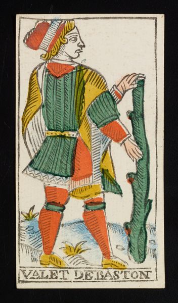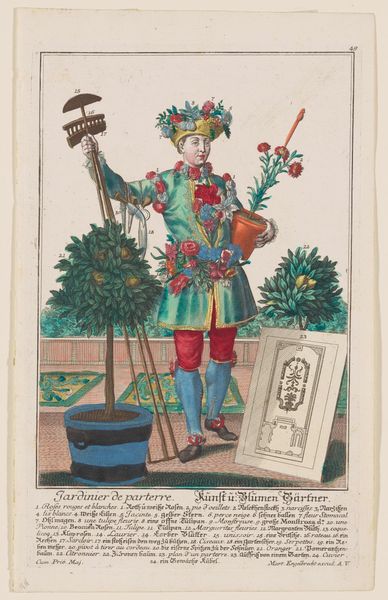 Curator: Here we have "Het nieuw arlequinspel / Le nouveau jeu d'arlequin," dating from 1833 to 1911, created by Brepols & Dierckx zoon. It is currently held at the Rijksmuseum and I believe the piece is a print. Editor: I'm struck by its whimsical nature. The use of numbered circles bordering the harlequin figure seems deliberately designed. What compositional elements stand out to you? Curator: Immediately, I observe the interplay between figuration and abstract design. The symmetrical arrangement of numbered circles framing the central figure creates a tension, a push and pull, against the dynamic pose of the Harlequin. Note also the limited color palette – primarily reds, blues, and yellows – that reinforces a formal unity. Editor: So, the colors and shapes aren't just decorative, they are integral to the meaning? Curator: Precisely. Each compositional choice, the linework, color and form is strategically implemented, suggesting the intent and care that goes into a painting's construction. The surface is activated by what seems like a playful symmetry and balance; can you describe it? Editor: Well, the artist strategically uses complementary colors to amplify each numbered design. The figure also has vertical balance because of its hat. Is it common to mix representational and non-representational styles in this period? Curator: To the degree the piece does, no. The juxtaposition, whether intentional or not, provides formal insights and aesthetic tension worth considering as an exercise in balance and juxtaposition. Editor: So, by considering the forms, colors, and composition, we're invited to focus on the art’s internal logic? Curator: Indeed. It underscores how crucial close looking and a deliberate formal examination remain to decoding and appreciating works from all periods and locations.