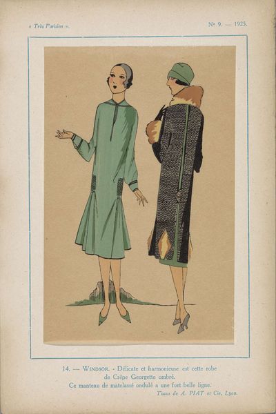 Editor: Here we have “Très Parisien, 1923, No. 1: Creation ALICE BERNARD…", made in 1923. It seems to be a fashion illustration, primarily in greens and blues. It strikes me as very Art Deco, with those geometric patterns and streamlined silhouettes. What do you see in this piece beyond just a fashion plate? Curator: This image, though seemingly just a snapshot of 1920s fashion, reveals much about the shifting roles of women in society at that time. We see the 'garçonne' silhouette – rejecting traditional feminine forms. What do those shorter hemlines and looser fits represent to you? Editor: Freedom, I guess? A breaking away from older, more restrictive styles, literally and figuratively? Curator: Precisely! This aesthetic embodies the burgeoning independence and self-expression of women post-World War I. This print circulated widely, imagine the subtle rebellion it represented in homes and public spaces. It was an accessible form of activism, declaring a shift in identity through style. What do you make of the reference to 'Emerald' in the inscription? Editor: Maybe Emerald was the designer’s way of subtly pushing for change by choosing a bold colour and using a striking title for the piece? Curator: Exactly, using "emerald," suggests more than just a colour choice, perhaps aligning with emerging concepts around gender and visual messaging. Fashion was then, as it still can be, a powerful statement of intent, and resistance. Editor: I never considered fashion illustration as a form of social commentary. It's fascinating to view this piece through that lens. Curator: It's about excavating the layered meanings embedded within seemingly simple imagery, and thinking about its legacy today.