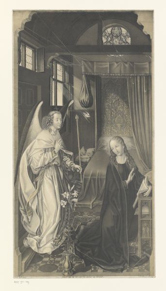 Editor: Here we have Johann Nepomuk Strixner's "Saint Luke painting the Virgin and Child," created in 1826 using ink, pencil, and paper. What strikes me is the juxtaposition of the intimate scene with the vast landscape visible through the colonnade. How would you interpret the symbolic language in this drawing? Curator: It's interesting how the act of artistic creation is itself portrayed through the icon of Saint Luke, often considered the patron saint of artists. The image subtly implies the power of the artist as a conduit, translating the divine—Mother and Child—into a tangible representation. What emotional impact do you think the mirroring of the ‘real’ scene with the representation contributes? Editor: It gives the scene a sense of layering and invites a dialogue between reality and artifice, or maybe the natural and the divine. I suppose Saint Luke’s gospel itself can be seen as a type of artistic rendering of events. Curator: Precisely! Notice, too, the careful rendering of textures and the use of light and shadow. The ink and pencil not only depict a scene but almost sanctify it through their deliberate use. This careful craft elevates the quotidian act of drawing into something of greater spiritual significance, and suggests we should observe reality with equal reverence. How does that interplay affect you as a viewer? Editor: It encourages a deeper contemplation. It makes me question how the artist's perspective influences our own understanding and, indeed, our spiritual experiences. Curator: Exactly! So much of our cultural memory comes down to representation. We find ourselves constantly decoding and recoding layers of meaning and that's what makes this image so evocative. Editor: I agree, understanding how artistic depictions contribute to shared cultural memory definitely gives a new perspective to the viewing experience.