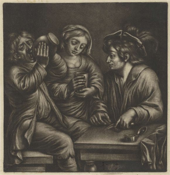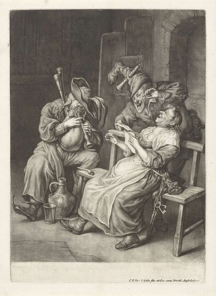 Curator: This is "Musicerend paar" by Jan van Somer, dating back to sometime between 1655 and 1700. It is created in the engraving medium, popular in the Dutch Golden Age. Editor: My first impression is that it is a darkly humorous snapshot. The composition seems carefully arranged, drawing the eye from the musicians to the figure lurking in the doorway, creating a narrative tension. Curator: Considering the social context of the Dutch Golden Age, this image offers insight into the rising merchant class and their consumption habits. Prints like these were accessible, affordable artworks that would be made by workshops dedicated to image reproduction to be distributed amongst many consumers, unlike bespoke oil painting productions for wealthy clients. Editor: Right, and even technically, the tonal range achieved in this engraving is quite remarkable. The textures, the shadows, and the light reflecting off the glass showcase incredible skill and meticulous execution. Curator: We can look into what types of materials and instruments were accessible in the era through workshops, or learn about sumptuary law and what each person could wear given the economic structures of the time, adding further layers to our interpretation. This wasn't merely aesthetic; it was deeply enmeshed with societal values and economic realities. Editor: I’m intrigued by the placement of objects - the musical instruments in use, and a woman peeking through a doorway. This almost theatrical arrangement seems carefully designed to provoke thought and conversation beyond the literal. What might this genre-painting really tell us about this period and it’s players? Curator: The image raises so many fascinating points about life during that time. Considering van Somer, how was he positioning himself when he was producing this kind of artwork? Did he consider it 'high art' or craft? I mean, where were these types of reproducible images consumed or placed within the homes of burgeoning middles classes? Editor: Thinking about the visual language here is essential to answering such questions and the clues about period art-making. How are visual balance, recurring shapes, and overall tonal unity functioning? It's through studying these aesthetic aspects, with social conditions of image creation in mind, we start unpacking its secrets. Curator: Agreed, this fusion illuminates both the immediate appeal of "Musicerend paar" and its resonance within the larger framework of the Dutch Golden Age and its reproductive economies of artmaking and printmaking at the time. Editor: It also enhances our appreciation of how technical skill, historical narratives, and artistic choices interact, offering an exciting pathway into understanding the piece's lasting influence in cultural historical imagination.