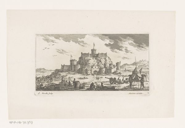 Editor: Here we have "Muur en een brug" or "Wall and a Bridge" by Gerard van Nijmegen, created around 1790. It’s a print, an engraving, and a drawing, currently held at the Rijksmuseum. It has such a stark, almost melancholy feel to it. I am particularly struck by the lines composing the stones; the architecture is very striking. How do you interpret this work? Curator: The composition immediately strikes me as a study in contrasts. Notice the stark horizontality of the wall itself versus the intricate detail in the surrounding foliage. Van Nijmegen has presented us with very considered and structured space, sharply offset by less organised space, if you will. Look at the mark-making itself: where does the line become denser and more deliberate? Editor: I see that near the base of the wall and the leaves, it's definitely denser there. It gives a sense of weight. Curator: Precisely. It anchors the composition. Now, consider the void: the blank space of the sky, and the less focused, light, and soft mark making that make up this plane. This emptiness serves to highlight the tangibility, the sheer material presence of the wall. It's almost sculptural, wouldn't you agree? Editor: That's true! The architectural forms feel very solid. I guess I hadn’t really considered the negative space. Curator: Often the most compelling aspects reside not only in what is represented but how those things are placed and executed in relation to other parts. The artist's hand, their choices, their marks - that's where the work truly exists. Editor: It’s amazing how much you can learn about a piece simply by looking closely at the lines and shapes! Curator: Indeed. It is through this careful and sustained looking that the dialogue with the artwork begins.