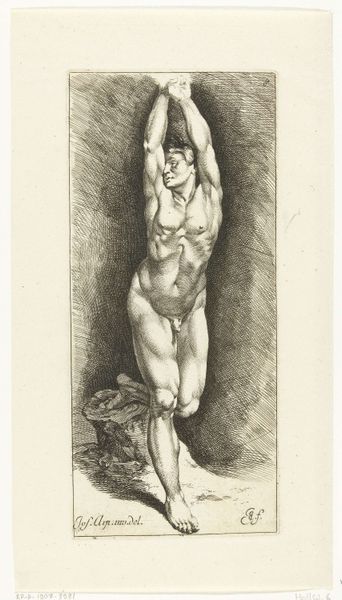 François-Nicolas Chifflart created this print of a male nude in the academy tradition. The figure stands in contrapposto, a pose of relaxed balance, with his arms raised above his head, hands clasped. This gesture, echoing classical sculpture, transcends mere physical form. Think of the “orans” posture, seen in early Christian art, where figures raise their hands in prayer or supplication. Here, the gesture, while not identical, shares a sense of reaching beyond the self, striving for something higher. In the Renaissance, this upward reach might signify aspiration toward knowledge or divine grace. Perhaps, in this modern academy study, Chifflart captures a more internalized yearning. The shadows around the figure suggest a psychological depth, a struggle to express the ideal form. This symbol persists, a testament to humanity’s continuous attempt to reach the divine and capture a transcendent experience.