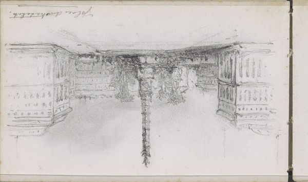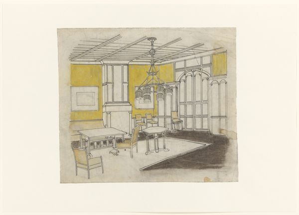 Editor: This is a photo reproduction of a design depicting a cafe, dating back to the 1870s and created by Willem Cornelis van Dijk. The level of detail is stunning. The composition seems carefully constructed. What draws your eye when you look at this piece? Curator: Primarily, I am drawn to the manipulation of space within the frame. Note how van Dijk uses linear perspective to create a believable depth, drawing the viewer into the intimate interior. The contrast between the empty tables in the foreground and the implied bustling atmosphere, signified by the decorations, produces an interesting tension. Do you see it? Editor: Yes, I see what you mean. The decorations almost seem haphazard against the very rigid structural elements. Is there significance to how these decorations interact with the architecture? Curator: Consider the geometry present. The circular tables act as a counterpoint to the strict angularity of the room and furniture. The garlands, draped loosely, further soften the lines. They seem to disrupt any sense of severe geometrical balance. This produces what one might describe as a dynamic discord. Editor: So, this "discord" contributes to a richer viewing experience through the layering of visual information? Curator: Precisely. It moves beyond mere representational accuracy toward an engagement with visual dynamics and their impact. It’s an exercise in semiotics of space. Editor: That makes me appreciate the careful placement of elements so much more! It's not just a room; it's a study in form and contrast. Curator: Agreed. Examining the arrangement of forms allows us access into its sophisticated manipulation of our perception.