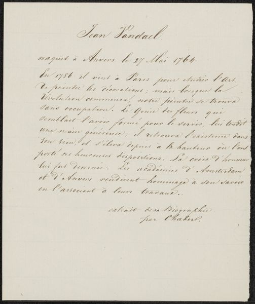 This document, in elegant cursive script, concerns the architect Louis Roelandt, born in 1786. The handwritten page provides an insight into the cultural institutions and patronage systems that shaped architectural careers in the Netherlands in the early 19th century. The text lists Roelandt's achievements, including buildings in Ghent, and notes his membership of distinguished societies. Crucially, it mentions that in 1829, King William I bestowed upon him the title of Knight. This detail speaks volumes about the relationship between artistic production and political power. Royal recognition was a significant marker of success, and demonstrates the importance of state support for architects in this period. By consulting archival records, royal correspondence, and architectural journals, we can gain a richer understanding of the social and institutional context in which Roelandt operated. Only then can we appreciate the full significance of this document.