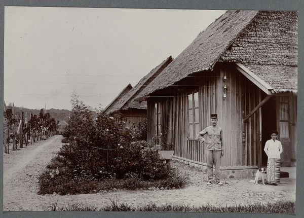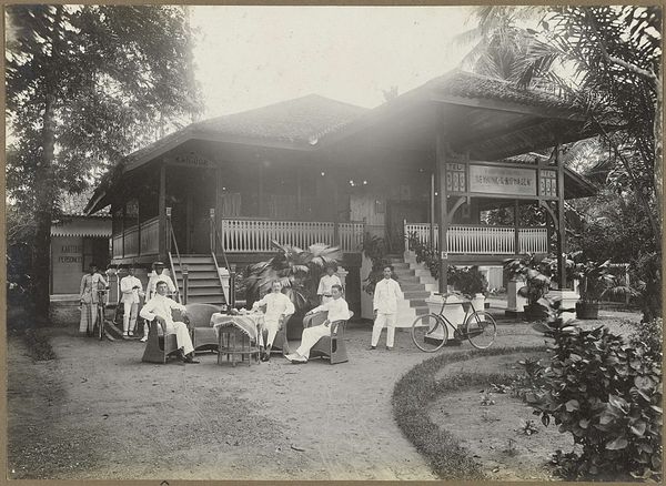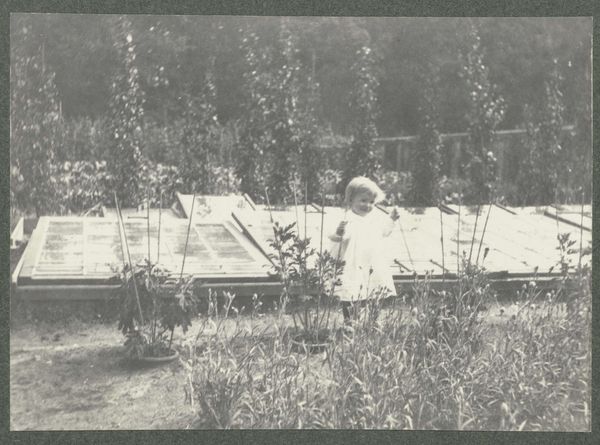 Editor: This gelatin-silver print from 1910, titled "The Photographer's Children...", captures a family outside a charming playhouse. It has such an intriguing stillness and sense of formality. What jumps out to you, what visual elements take precedence here? Curator: The careful arrangement of the figures is paramount. Note how the subjects are positioned relative to the geometry of the playhouse: the strong horizontal line where it bisects, anchoring the human subjects against the landscape. This emphasizes a tension between nature and constructed space. Editor: I see that now. The playhouse is very symmetrical, and the figures mirror its structure. Is that significant? Curator: Indeed. The formal composition is not merely decorative; it's a device to explore the structuring of social relationships. Consider the textures: the rough wood of the house against the smooth fabric of the children’s clothes, underscoring social hierarchy and constructed identity. Editor: So the contrast draws out deeper meaning? I hadn't thought of that! Curator: Precisely. Furthermore, examine the tonality – the photograph's delicate shades of grey serve to highlight minute details, adding to its depth and intricate construction. Editor: That makes me see it differently now. The playhouse, the textures, it’s like a stage set. Curator: And it invites a sustained visual engagement, beyond a mere snapshot of a moment. Through line, form, and texture, Pauw van Wieldrecht gives a rigorous perspective into Edwardian society. Editor: I hadn’t realized there was so much in the composition itself. This formalist approach really pulls apart the layers within this photograph. Curator: Absolutely. Now, you might start to think about photography of this era in general, not just for its sentimental subject, but the power it carries in presenting complex ideas in a very formalist language.