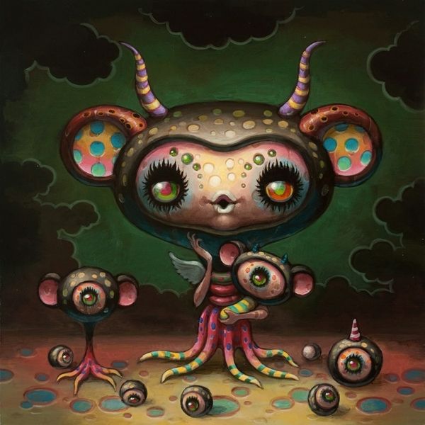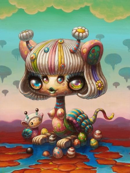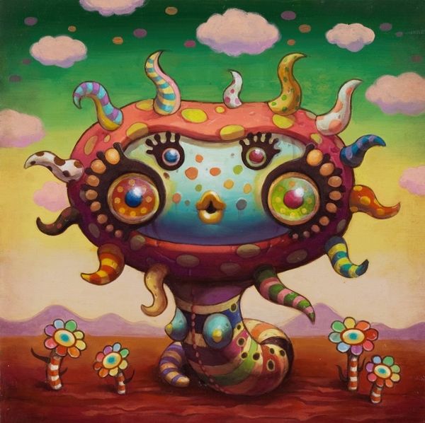 Editor: Here we have "Lady Snail" by Yoko d'Holbachie, an acrylic painting that throws us headfirst into a world of pop surrealism. It feels like a curious caricature, whimsical and maybe a tad unsettling with those wide, knowing eyes. What leaps out at you when you look at this piece? Curator: Oh, "Lady Snail"! She whispers of hidden dreams, doesn't she? I see echoes of childhood fairytales, reimagined through a darkly humorous lens. The candy-colored palette initially lures you in with its playful charm, then the strangely knowing expression of the figure gives you pause. Holbachie’s blending of organic forms with mechanical components...does it remind you of anyone? Like a surrealist Dr. Seuss? Editor: I hadn't thought of Dr. Seuss! The colors definitely fit, and the mechanical snail shell adds a layer of complexity. It is slightly disturbing because you don't quite understand what you're looking at! Do you think that there is an intention behind that? Curator: Precisely! Holbachie enjoys the push and pull between the grotesque and the endearing, a beautiful, disquieting tension that's so human. That push-pull – is it beauty or something monstrous that attracts us to her? Do you see it too, that subtle melancholy lurking beneath the surface of bright, bubblegum hues? Editor: Now that you mention it, I do see that melancholy, almost a world-weariness in those big eyes. I initially saw only whimsy, but there's a lot more there. Curator: Exactly! It's about embracing the beauty within the bizarre, recognizing that even in fantasy, threads of reality—of sadness, of introspection—are inevitably woven in. I think she also speaks of resilience and adaptation! Editor: So it seems like beneath the colorful and bizarre, there's a portrait of complex emotions. "Lady Snail" is much more than just a pretty, surreal face. Curator: Precisely! It’s an invitation to look a little deeper, don’t you think? To embrace the weird and wonderful nuances within ourselves.