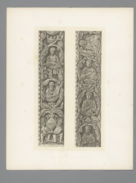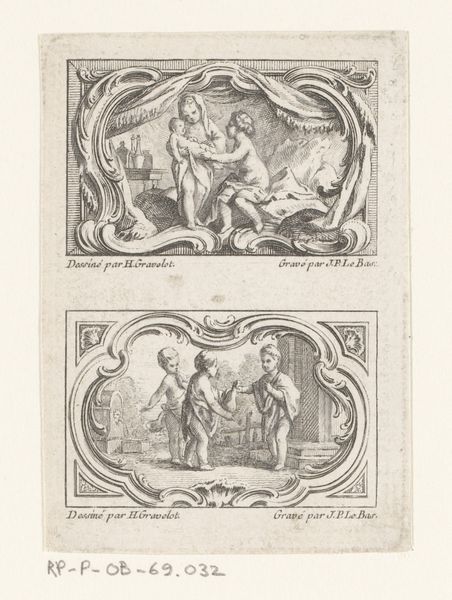 These two decorative designs, made by an anonymous artist, appear to be rendered in ink on paper using an engraving process. The contrasting halves of each design, one a delicate outline and the other more densely shaded, demonstrate the engraver's technical skills and the precision required for such intricate work. Engraving involves cutting lines into a metal plate, which is then inked and pressed onto paper. The crisp lines and fine details here suggest a highly skilled artisan, deeply familiar with the tools and techniques of printmaking. These designs likely served as patterns for other craftspeople, perhaps for use in textiles, furniture, or architectural details. The presence of a crown in the lower design hints at a royal or aristocratic association, suggesting a clientele with means and a taste for luxury. This print shows the close relationship between design, production, and consumption in earlier eras, when handcrafted objects were valued for both their beauty and the labor invested in them. It reminds us that even seemingly simple designs often carry complex social and economic meanings.