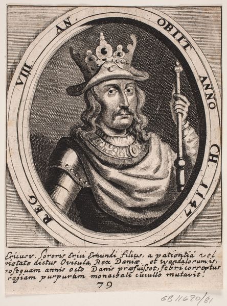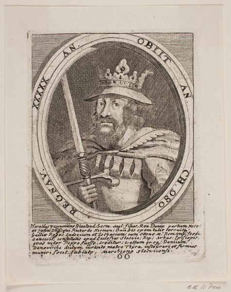 This is an engraving, Kong Huglek, by an anonymous artist, now held at the SMK. The portrait is contained within an oval frame, immediately drawing the eye. Observe the contrast between the densely hatched background and the figure. This deliberate use of light and shadow shapes the king's features, emphasizing the texture of his beard and the ornate details of his crown. Note the inscription encircling the portrait, a semiotic device common in historical portraiture, framing not just the image but also its interpretation. The lines, while precise, lend the image a certain graphic quality typical of the medium. The visual structure invites a deeper understanding of representation and power, prompting reflection on the codes and conventions that define historical portraiture. This piece offers a glimpse into how images negotiate authority and meaning through carefully constructed visual forms.