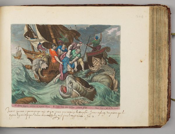 Curator: Well, this looks intense. A chaotic scene rendered in what appears to be thread? Editor: Exactly! What you're looking at is a baroque textile piece titled “Zeeslag,” created by Josse de Vos around 1715 to 1725. Curator: A "sea battle." It's dramatic. You’ve got struggling figures in the foreground, some in a small boat, others flailing in the waves, and then this rather flat depiction of naval combat receding into the distance. I’m struck by how physical it all seems, even as a textile. One can feel the roughness of the spun material but the artistry elevates it. Editor: I see this textile less as a representation of an actual naval battle, and more as an instrument to project power. These tapestries, imagine how they functioned in grand halls, reinforcing the prestige of those commissioning them. Notice the allegorical figures woven into the border, each element a symbol, contributing to a grand narrative. Curator: Absolutely, and it prompts me to consider the labor involved in its production, how this narrative was constructed, literally woven, through the hands of many artisans, a large workshop using dyed threads... it’s quite extraordinary when you think of it as raw materials transformed into propaganda! Editor: That’s precisely where its significance lies! And given the probable commission by some governmental entity to illustrate some naval prowess, you can read this textile also as an archive to comprehend state propaganda campaigns of the 17th and 18th centuries. A way to influence popular understanding. Curator: That top-down manipulation is obvious, of course. But what about the individuals who spent countless hours creating the piece? How did their participation in its making influence how it was made? I bet some were much better weavers than others and had preferred fiber. How did this play into the design? What can these threads tell us about its production and its history of use, in different rooms in different times, and, importantly, different ideologies? Editor: That's a really important avenue of inquiry to reveal its long-term symbolic efficacy. After all, these scenes of supposed strength get re-contextualized by our very interrogation, and how that process helps us decipher history! It has truly shifted my reading of this art piece. Curator: It gives you a lot to consider.