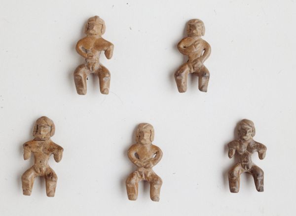 Curator: Well, these diminutive earthenware figures are believed to have been crafted by the Tlatilco people around 1500. The Minneapolis Institute of Art is fortunate to hold these Miniature figurines in its collection. Editor: Intriguing. My first impression is one of great variety, despite their size. Each little sculpture seems to embody a unique personality. Curator: Indeed. The Tlatilco culture, which flourished in the Valley of Mexico during the Early and Middle Preclassic periods, is particularly known for its ceramics. These figures would have been made by women using local resources and methods and were most likely for adornment, such as beads. Editor: So, their value isn’t so much intrinsic; it derives from their connection to the everyday lives of these women? Their bodies and attire, which is carefully carved onto some of the figures, become a code through which Tlatilco life can be examined. And looking closely at these objects you start to get the sense of something profoundly human—a very personal form of production. Curator: Precisely! The forms of labor involved in making ceramic pieces is very evident. What can appear quite uniform is in fact full of diversity, thanks to these little adjustments in how the pieces are fashioned. It suggests these were a vital and valued product of social creation, perhaps linked to ideas of creation or the domestic realm, which scholars have speculated on. Editor: There’s something profoundly compelling in how so many very simple forms create great variety within an established system. The texture and color create depth, the proportions are elegant and sensual. Together, the components function together to give each figure a strange charisma that elevates each piece. Curator: The labor involved would also have shaped the aesthetic, creating that distinctive feel as material realities affect what could be created with limited means, of course. These women must have become such practiced experts. Editor: It prompts reflection on the artistic possibilities born of specific means, doesn't it? How materials can allow a whole world of aesthetic variations to blossom. Curator: It does. Next, shall we look at the social history related to pottery in Tlatilco culture? Editor: Certainly. It sounds fascinating.