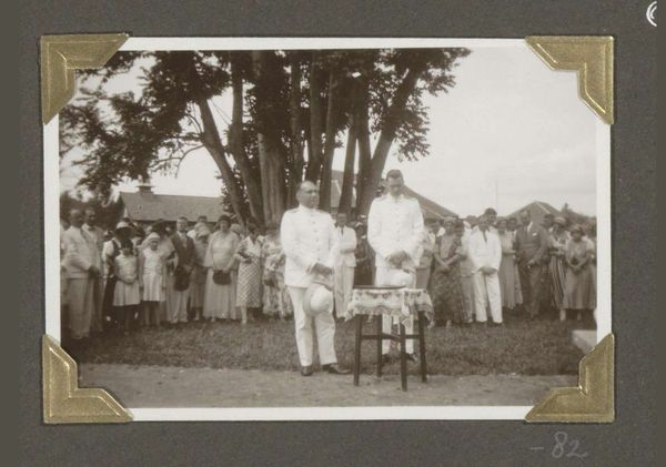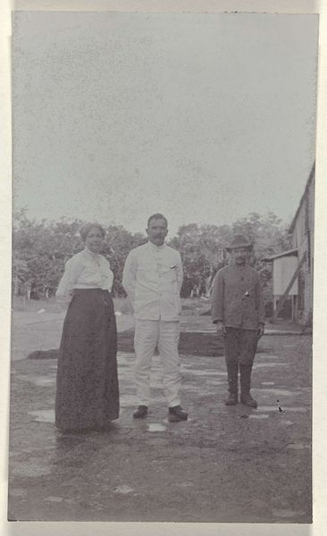 Curator: Before us, we have an intriguing gelatin-silver print. Its title suggests a scene in Albina, Suriname, possibly from 1912: "De familie Gonggrijp poseert met Surinaamse kinderen in Albina, Suriname." Editor: Immediately, the stark contrast strikes me—the all-white attire of the Gonggrijp family against the darker skin tones and modest clothing of the Surinamese children. The composition emphasizes this division. Curator: Absolutely. White, particularly in the colonial context, often symbolized purity, authority, and even a sort of supposed moral superiority. The positioning, with the family centrally located and the children arranged almost as objects around them, reinforces this hierarchy. It resonates with established tropes of Orientalism. Editor: The tonal range is quite limited. Look at how the diffuse light softens the details. The formal dress and hats further emphasize their distance from the surroundings. There’s an intentional theatricality. Curator: Indeed. And note how photography itself becomes a tool for asserting dominance. This staged photo becomes a lasting record of a power dynamic. It echoes a broader colonial narrative prevalent at the time, not just in Suriname, but throughout colonized territories. The gaze is so deliberate, so assured in its entitlement. It almost feels ethnographic in intent, but functions to reinforce rather than understand. Editor: Ethnographic in so far as it reduces subjects to objects in service of a controlling idea? Agreed. Even the textural contrast interests me; smooth fabrics versus coarse cloth and exposed skin... they amplify those power dynamics you pointed out. The umbrella seems like a signifier of bourgeois formality amidst poverty. Curator: Precisely! We’re not simply seeing a photograph, but a layered cultural document filled with implicit messages. Its simplicity belies the complexity of its underlying narrative, one woven with threads of colonial power, cultural imposition, and social distance. Editor: Considering it through the lens of the era's power structures offers vital context to interpreting the artistic intentions that crafted this visual rhetoric. So much semiotic weight rests within its apparently simple formal elements. Curator: Thank you for joining me in unpacking the loaded visual story present in this powerful photograph. Editor: A pleasure, it really highlights the constructed nature of photographic 'truth.'