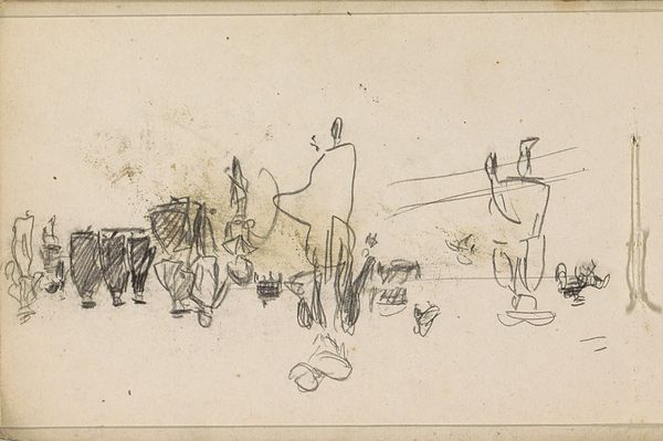 Curator: Here we see a drawing by Oskar Kokoschka, held in the Tate collections. It's a quick sketch, about 25 by 37 centimeters. Editor: It feels so immediate, almost like a fleeting thought captured on paper. The sketchy lines of colored pencil create a dreamlike scene of horses and riders. Curator: Kokoschka was known for his expressionistic portraits and landscapes. This work gives insight into his process and highlights the performative nature of sketching at this scale. Editor: Right, you can practically feel the artist's hand moving across the paper. The choice of colored pencils is interesting. It keeps the sketch light, almost ephemeral, rather than committing to a heavy line. Curator: And in doing so, it opens up discussions on how art institutions traditionally value finished works over these preparatory sketches, which are nonetheless revealing. Editor: It’s about the labor of art making, a raw glimpse into the artist's practice. A reminder that even the grandest artworks begin with simple materials and a moment of inspiration. Curator: Yes, and it gives us insight into the artistic process itself. Editor: Precisely. A fascinating testament to artistic creation.