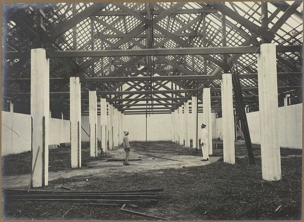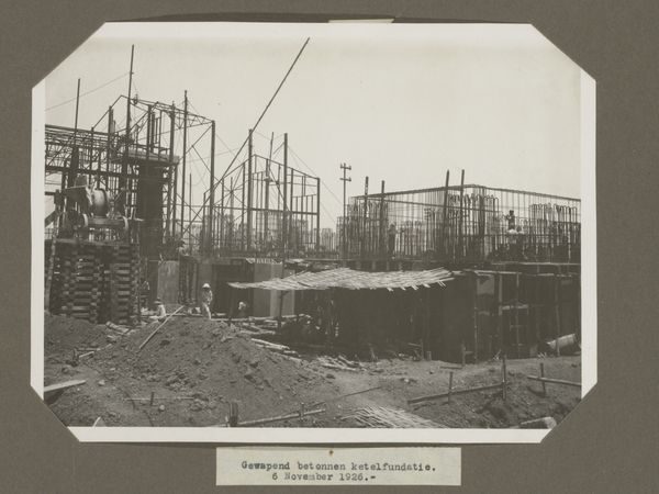Editor: This photograph, taken in 1927, shows the ‘S.O. Goenoengsari. Societeit in aanbouw’ during its construction. The grainy, black and white image captures a building site, seemingly somewhere tropical. I’m curious, what do you see in this piece beyond just a building under construction? Curator: What I see is a very telling image about Dutch colonialism and the making of social spaces. A "societeit," or society building, would have been a place of social gathering and leisure, but segregated, no doubt catering primarily to the European colonizers in the Dutch East Indies. Editor: So, it wasn't just about building a structure, but also about establishing a social hierarchy? Curator: Precisely. The act of construction itself becomes a performance of power, asserting a European presence through architecture and claiming space. Who do you think were the people on the scaffolding? Editor: Likely local laborers. It’s a stark visual reminder of the dynamics at play. The Europeans designed it, and local people built it. Curator: And consider the date, 1927. This photograph exists as a document of that colonial moment and the shaping of social spaces in colonized lands. The very act of documenting the building, through the photographic medium, further emphasized colonial control. What are your thoughts on its legacy? Editor: I hadn't considered the photograph as an extension of colonial power, it is unsettling, yet so relevant. It forces me to think about the unseen narratives embedded in seemingly simple architectural images. Curator: Exactly, seeing this image, knowing where and when it was taken, has taught me that photos can preserve more than just architectural details. They are the result of colonial and socio-economical landscapes, not impartial representations.