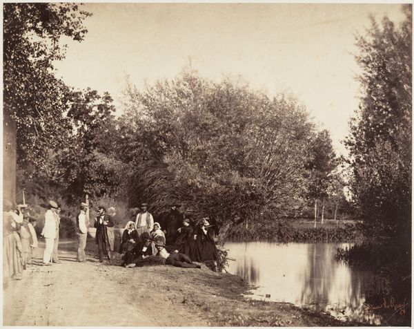 Editor: This is "Gezelschap rond een tafel te Leiden," a gelatin silver print by Jan Goedeljee, sometime between 1850 and 1900. It’s a gathering of people in a garden, the light soft, almost hazy. What I find fascinating is how…contained it feels, despite being outdoors. How do you interpret this work? Curator: It is intriguing how, even in the open air, social conventions create their own kind of enclosure, isn't it? Consider the carefully arranged table, the figures seated, a tableau vivant. Notice how they're dressed and posed, how their interaction, or lack thereof, communicates unspoken rules. This photograph carries echoes of Dutch Golden Age group portraits, a cultural memory subtly influencing how the subjects present themselves. The photograph transforms the actual people into icons of propriety and social order. Do you see any indicators of class at play here? Editor: Yes, their attire! It's not ostentatious, but certainly conveys a sense of bourgeois respectability, from the dark suits to the tailored dresses. Curator: Precisely. Their clothing, the furniture, the well-kept garden: all symbols. Now, reflect on the man standing apart. He represents the observer, the outsider, maybe even the photographer himself, implicitly commenting on the scene. What meaning does his presence add to this gathering? Editor: It’s as though he's acknowledging us, the viewers, and directing our gaze to this very particular moment in time. Curator: Indeed! Through his presence, Goedeljee invites us to decode this symbolic language. This image functions almost like a stage set, each element carefully placed to reinforce ideas about society, leisure, and status during that period. Editor: It’s fascinating how a photograph, which we think of as capturing reality, can be so carefully constructed and symbolic. Thanks, that gives me a lot to think about! Curator: And for me, reflecting on its deeper significance opens a window into a world of encoded meaning, subtly preserved for those who choose to see.