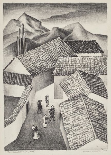 Loraine Moore made this print of Picuris Pueblo sometime in the mid-20th century. The print shows the Pueblo under a night sky with a cloud, which may reference the history of the Pueblo's resistance to attempts to extinguish the traditional religious practices of its people. Moore depicts the Pueblo using simple shapes and earth tones. The crosses above the buildings are markers of the enforced history of Christianity in this region, but the ladders and adobe construction also indicate the persistence of traditional ways of life. Moore’s work belongs to a genre of images of the American Southwest that valorize a simple way of life rooted in the land. To understand this image better, one could research the artist's biography, the history of the Pueblo, and the cultural context in which the image was made. As historians, it is important to understand the role of art in the creation and maintenance of cultural identity and the complex social, economic, and political factors that shape its production and reception.