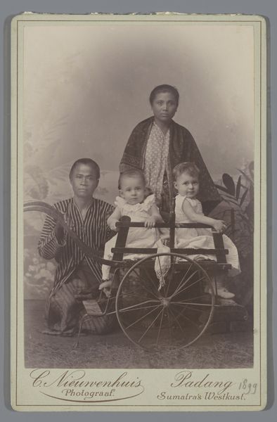 Curator: Well, hello! Today we are looking at an albumen print called "Groepsportret van een onbekende man, vrouw en kind", a group portrait, by Dirk van Proijen dating back to sometime between 1868 and 1873. It's really got that austere, almost haunting feeling that's so common with photographs of that era. Editor: Haunting's a great word for it! There's such a formality, you know? Like, what stories are hidden behind those tight lips and straight postures? It’s like each person is holding a secret. Curator: Absolutely, it is that precise emotional register that really draws me into the work. Look at the placement—the man, woman and child, not touching really, the little girl carrying a strange object, an odd stillness. All very constructed. The family's social position being consciously presented for posterity. But what about the woman, for instance? What would a day in her life involve? Editor: Exactly, and you can sense the power dynamics in the photo, right? The man placing his arm on the woman, yet standing further ahead with more assured body language... the subtle yet undeniable hierarchies embedded into a supposedly 'objective' medium like photography. Then you have the girl carrying something... looks almost like a small cage. What do you make of that? Curator: A cage, perhaps, but empty. Or maybe a fancy purse? Something delicate and small, hinting at childhood privilege, perhaps? It sets her apart a little. Almost dreamlike—because here they are, playing for the camera as part of their day. An everyday luxury we forget was even once a thing. Editor: True! That detail just speaks volumes about gender and childhood during that time. What also strikes me is how portraits like these are seldom of the working classes. There are whole segments of the population underrepresented, and so photography, like art, ends up skewing the historical record. Who *isn’t* being represented? Curator: Indeed, the whole medium of photography initially reinforces privilege. That's always at the back of my mind when I consider photos such as these... the families or people who were able to participate in this novel experience are also often wealthy ones. Which raises further questions on agency and accessibility. Anyway, it has been quite a thoughtful look, if at times wistful, at Mr. Van Proijen’s piece here today. Editor: Definitely. Thinking about who makes art, who art represents, and who gets left out... that is such an important discussion and still resonates today. It really made me think!