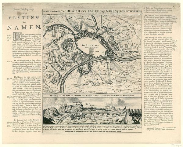 Editor: This engraving, "Kaart van het beleg van Londonderry, 1689," dating from 1689 and held at the Rijksmuseum, gives a bird's-eye view of a cityscape under siege. I’m immediately struck by the stark contrast between the rigid geometric shapes of the fortifications and the more organic curves of the river. It’s like order against chaos. What can you tell me about the historical context that shaped this image? Curator: That tension between order and chaos speaks volumes about the moment this map represents. It was produced during the Williamite War in Ireland, and Londonderry's resistance to James II’s forces became a key symbolic event. Think about the political messaging embedded within such an image. How does the map, ostensibly an objective representation of the siege, participate in constructing a narrative of Protestant resilience? Editor: I see what you mean. It's not just a factual record; it's propaganda, almost. The clear depiction of the city's layout, and the surrounding forces makes it feel strategic, but there's also that underlying message about enduring a siege. What role did these images play in shaping public opinion back then? Curator: Maps like these were powerful tools for shaping public perception, particularly in urban centers like Amsterdam, where this was printed. They visually communicated the progress of the war, reinforced ideas about national identity, and influenced popular support for particular political factions. Consider also, the role of the printing press. These images were not passively consumed; they were circulated, debated, and incorporated into a broader political discourse. Whose story is being told here, and who gets to tell it? Editor: So, it’s less about geographical accuracy and more about constructing a specific narrative. That definitely shifts how I see it. It is a strong argument for considering art’s role within political landscapes, both present and past. Curator: Precisely. Understanding the historical context helps us to deconstruct the intended messages and reveal the complex interplay between art, politics, and society. Looking at it, its value lies less in cartography and more in understanding 17th-century European social and political perspectives.