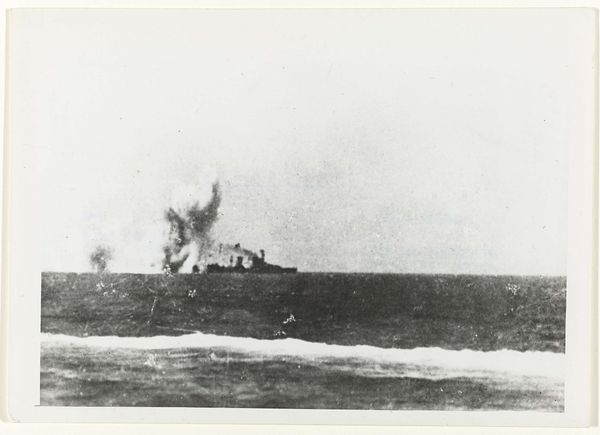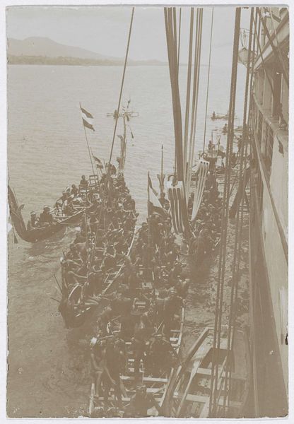 This photograph of a naval fleet review, likely taken by the Keystone View Company, presents a world captured in shades of grey, a tonal dance. The image is a study in texture, from the smooth expanse of the sky to the complex layering of the ship's structure. I'm struck by the contrast between the solid mass of the ship and the delicate tracery of the planes overhead, like scattered afterthoughts against the grey sky. See how the planes are a set of near-identical, machine-produced elements, floating above the rougher, more handmade looking surface of the ship. The planes are like a swarm, a group, while the ship is a singular, massive, heavy, impressive thing. I'm reminded of Gerhard Richter's blurred photographs, how they transform the real into something dreamlike and elusive. Like Richter, this photograph embraces ambiguity, inviting us to find our own meaning in its muted tones and ghostly forms. The conversation between artists, across mediums and time, is endlessly fascinating.