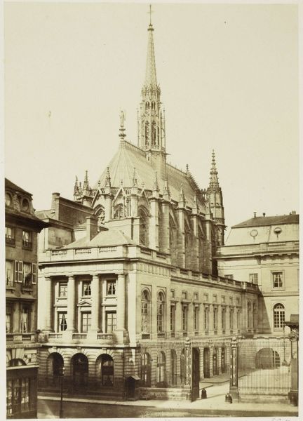 Curator: We’re looking at “Notre Dame de Bonsecours, près Rouen,” a gelatin silver print from 1852-1854 by Edmond Bacot. It’s quite a stark architectural portrait, isn’t it? Editor: It feels mournful. The monochrome tones, combined with what appears to be a cemetery in the foreground, create a heavy, contemplative mood. Curator: Note the tonal range. The architectural details are crisp and defined, almost relentlessly so. Bacot expertly used the new medium to document the elaborate Gothic Revival architecture. The church’s geometric intricacies are remarkable. Editor: Beyond its architectural precision, I find myself wondering about the role of faith in a rapidly changing 19th-century world. The looming church could symbolize both hope and the rigid social structures of the time, especially considering the political upheaval happening in France during those years. Curator: I understand, but look how Bacot has arranged the composition, how the building becomes a sequence of repeating triangles. From the spire to the smaller arched windows, and gables that line the rooftop; notice, too, the textures rendered on the stone facade. It presents a self-contained aesthetic system. Editor: Fair enough. Still, I’m drawn to how the graveyard disrupts that contained system. The varying heights and weathered surfaces on each headstone speak volumes about individuality and the passage of time, acting as a counterpoint to the rigid, eternal aspirations of the church. Perhaps there’s a commentary on mortality versus the institution? Curator: It's also important to think about what photography meant in the 1850s, and how photography transformed perception and created the new relationship to objectivity. Editor: Absolutely, a debate over "objectivity" versus experience! Looking closely, one can sense that Bacot isn't simply recording a building but also interpreting it and, with the help of cultural context, inviting reflection on broader human conditions. Curator: It highlights that tension very well. Editor: Exactly, and brings together the convergence of these readings—architectural, structural and material—as both form and content, so that the work continues to resonate.