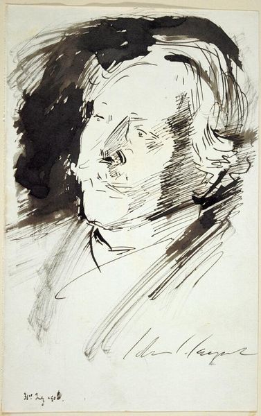 Editor: Here we have "Portrait Study, a Head of a Man" by Sir Francis Seymour Haden. It's a quick sketch, almost like a fleeting thought captured on paper. It feels unfinished, yet somehow complete. What do you see in it? Curator: The beauty lies in the immediacy, doesn't it? It's like catching someone in mid-sentence. Haden, primarily known as an etcher, uses these raw lines to suggest not just form but also… character. The scribbled hair, the intense gaze – it hints at a restless spirit, don't you think? Editor: Absolutely! It does feel like we're glimpsing something private. Curator: Yes, and perhaps that's the magic of a study. We're not meant to see everything, just to feel the artist's process, the spark of creation. Editor: I’m definitely seeing this in a new light. Thanks! Curator: My pleasure! It’s a privilege to share these insights with you.