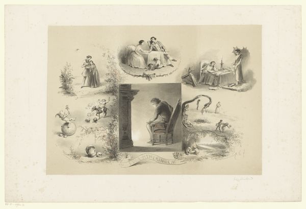 Curator: This is a combined work by George Cruikshank, presented by the Harvard Art Museums, titled "An Easy Place, 'Dress! and Undress', Practise!, and The Last Fond Look," using the technique of chine collé. Editor: It’s giving me a strong sense of social satire; the linework is so sharp and precise, it feels almost cruel in its observation. Curator: Exactly! Cruikshank's era was rife with social anxieties. Notice the progression, or perhaps regression, of societal expectations for women. The performativity of gender is on full display. Editor: The materials themselves—the paper, the ink, the printing process—speak to the mass production and dissemination of these ideas. He’s making accessible what was previously confined. Curator: It's a commentary on the commodification of these ideals. We are now able to dissect how art plays a role in perpetuating these narratives. Editor: Agreed. The crispness of the printmaking, in this context, sharpens the cutting social critique. Curator: It's a window into the performative nature of identity through the lens of printmaking. Editor: Seeing the process of its creation really drives home the systematic way these gender roles are constructed.
