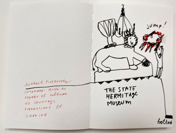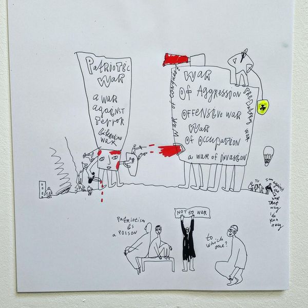 Here’s an Untitled piece by Alevtyna Kakhidze, made with what looks like felt-tip pens, maybe crayons, on paper. The directness of the marks and the rawness of the color are so upfront, there’s no hiding here. It’s like looking at someone’s diary. I am struck by how the quality of the line itself makes you feel something. There’s one figure, slumped, with a sort of red cloud hovering nearby; the cloud seems to speak for the figure, or maybe threaten them. And then another figure, standing, holding a gun, next to a waving Russian flag. The marks are so immediate, and yet they speak to a much larger conflict. What’s interesting is, that although it’s such a simple image, it reminds me of some of Picasso’s more overtly political drawings, which were also about war and suffering. I guess art is always in conversation with itself, and with the world, isn’t it? Even when it’s at its most direct and seemingly artless.
