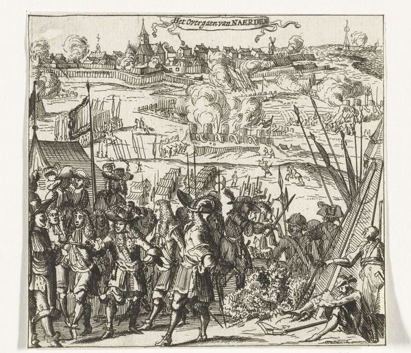 Curator: Welcome. Today, we’ll be discussing “Gevecht voor een stad,” or "Battle for a City," a fascinating woodcut engraving currently held in the Rijksmuseum, created between 1556 and 1624. It's attributed to Christoffel van Sichem I. Editor: The scene just crackles with energy! The spears converging create an intense focal point and convey a feeling of brutal force and overwhelming chaos. I immediately feel transported to a time of siege and conflict. Curator: Exactly. The image represents a tumultuous period marked by significant socio-political strife and the constant power struggles emblematic of early modern Europe. Van Sichem’s depiction, using the graphic strength of the woodcut medium, vividly illustrates these themes of confrontation and resistance. The fortified city is rendered quite detailed, which contrasts sharply with the blur of figures below. What do you make of the difference in those rendering choices? Editor: Well, the city, positioned high above, serves as the established order, an almost untouchable entity of power. But the chaos below—the struggling bodies, the angled spears—signify challenges to that power. All the lines, whether architectural or weaponry, create visual symbolism. Those spears aiming skyward represent the desire for conquest, but they’re disorganized, almost futile, against that imposing castle structure. The engraver makes sure you focus on that architectural symbolism, while showing the messy reality of conflict. Curator: That’s insightful. If we consider that Europe in that period was struggling to reconcile old medieval systems with newer Renaissance ideals, you can see the battle in a metaphoric light. The faceless soldiers represent groups fighting for land but perhaps also ideals. Van Sichem also may subtly imply that conflict’s purpose is to uphold older power dynamics represented in the city gates. The composition becomes less of an action piece and more of a political commentary on ceaseless fighting. Editor: I see what you mean. The overall image underscores both the violence of those efforts and, as you noted, the rather fixed structures for which all are dying to either protect or to occupy. It asks viewers to consider those cycles of symbolic violence. What legacy do we create for ourselves through such clashes? Curator: A powerful, thought-provoking visual interrogation. Its relevance persists as a reflection on current issues surrounding power, representation, and societal hierarchies. Editor: It does leave one with much to contemplate concerning our persistent need to struggle and the timeless nature of its emotional cost. Thank you.