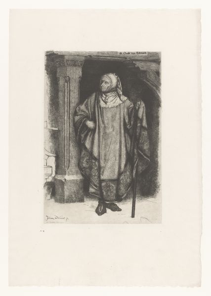 Curator: Here we have an engraving from sometime between 1590 and 1662, attributed to an anonymous artist, titled "Heilige Pelagia van Antiochië als kluizenares"—Saint Pelagia of Antioch as a hermit. Editor: The high contrast of the lines and the aged paper gives it a somber, almost severe feel, doesn’t it? You can practically feel the coarse texture of her garments through the engraver's meticulous strokes. Curator: Indeed. Notice the linear precision; each line seems deliberate in its construction of form and light. Observe the figure’s pose, kneeling, with a rosary, emphasizing devotion and asceticism through formal design. The composition, framed within this confined space, really locks your focus on the saint's piety. Editor: But consider what the process of engraving entails—the physical labor of carving into the metal plate. The texture of the paper also informs how we engage with this piece. It wasn’t just about replicating an image, but about craft, the tactile engagement with materials to evoke an emotional response from the viewer. And the reproduction suggests broader access, disseminating the image of Saint Pelagia to many. Curator: I appreciate the emphasis on material, yet, the composition steers my eyes toward the expressive contours. The angularity of her features and the cascading lines that denote her simple robe—there's a visual language there suggesting a soul stripped bare before God. This deliberate manipulation of form evokes the Baroque aesthetic ideals. Editor: True, but that aesthetic, too, is influenced by the demands of production. What size plates were available? How quickly could images be replicated for a popular audience hungry for devotional aids? These practical realities surely dictated some of the aesthetic decisions, marrying faith and industry. Even that tonal quality of the paper speaks to its social and economic history, reflecting access and purpose beyond mere aesthetics. Curator: Your insights really deepen my own consideration of art objects. By acknowledging process alongside the artistic form we move towards a more comprehensive appreciation. Editor: Exactly! To look beyond the purely visual lets us value the means by which artistic visions come to be and their role within society.