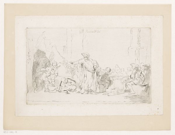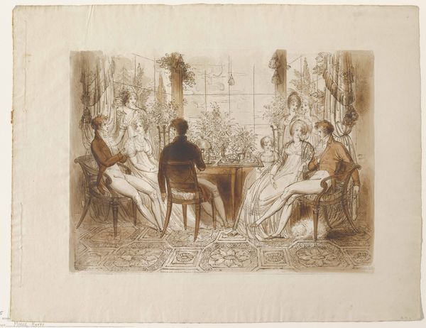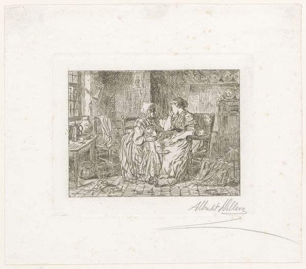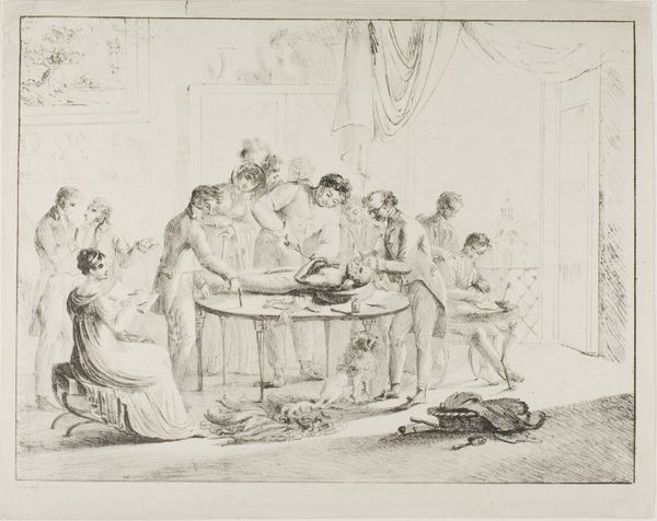 Editor: This pencil drawing, "Two Women Embracing" by Herman Frederik Carel ten Kate, feels very intimate despite depicting a whole group of people. What strikes me most is the intense detail on the fabric of the tablecloth juxtaposed with the relatively simpler rendering of the figures. How do you interpret this choice of materiality? Curator: It’s crucial to recognize that this piece emerges from a specific historical context, between 1832 and 1891. Considering the availability and cost of different materials during this period, and that this is a drawing, one might examine the type of pencil used – the lead composition, its source – as directly impacting the artist's ability to achieve that level of detail. Editor: So you're saying the emphasis on the tablecloth might be less about artistic intention and more about the inherent properties of the materials and how accessible they were? Curator: Precisely. What were the social conditions and available resources influencing Ten Kate’s practice? He perhaps chose to highlight textiles, commenting on their growing prominence in domestic settings during the rise of industrial manufacturing and availability of commodities to decorate one’s home. Look closely at how light interacts with the graphite on paper – where does he invest labor and how might that choice tell us more about contemporary Dutch life at the time of the drawing’s creation? Editor: That's a completely different way of seeing it! I had focused on the emotion of the scene, but looking at it from a material perspective reveals a subtle commentary on production and consumption. Curator: Exactly. And consider who owned such furnishings, which in turn can speak to social stratification as it relates to labor. Understanding that can drastically alter our emotional read of the piece. Editor: It's amazing how much history can be revealed just by analyzing the materials. It enriches the experience far beyond simply admiring the scene. Curator: Indeed. This is a case study in reading art as a cultural artifact, one deeply embedded within its material conditions.