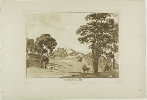 Curator: Immediately, I'm struck by the delicate use of color; a sense of serenity washes over me. Editor: This watercolor on paper, titled "Gezicht op Leeuwarden vanuit het noordwesten," which translates to "View of Leeuwarden from the Northwest," was created by Isaac Reijnders Sz. in 1849. What captures my attention is its demonstration of the burgeoning plein-air tradition, suggesting the artist worked directly from observation. Curator: I can certainly see that—the landscape feels so alive! I'm particularly drawn to the contrast between the soft, diffused light in the sky and the more defined shapes of the buildings and figures in the foreground. It’s an idyllic scene, very calming. Editor: Look closer. The materiality is vital here. Reijnders uses watercolor to mimic the very atmospheric conditions that shaped labor at this time. The loose washes give way to the daily work of farming or, likely, livestock tending represented here. The laboring figures underscore the relationship between land use and pictorial space, even with this idyllic aesthetic. Curator: But beyond just depictions of labor, do you see how Reijnders’ placement of the city on the horizon gives it almost a fairytale-like quality? And then, with those towering structures of industry--they give visual interest. It's a beautifully balanced composition, the dark trees mirroring each other on either side, framing the scene perfectly. Editor: Precisely. The strategic compositional choices create and uphold social structure. Reijnders likely produced many studies, and preliminary sketches, before settling on this perspective and the materials to present a clear view that supported the existing order of production and power dynamics. Curator: The artist uses the Romantic landscape style of that era and gives us such an evocative image. This view pulls you into its story in a very subtle but powerful way. Editor: I agree. Thinking about the materials of labor – paper, pigments – and the socio-economic conditions for Isaac Reijnders Sz.’s time to create this image has given me a richer and deeper sense of 19th-century Leeuwarden.