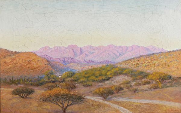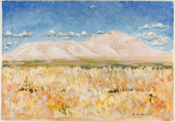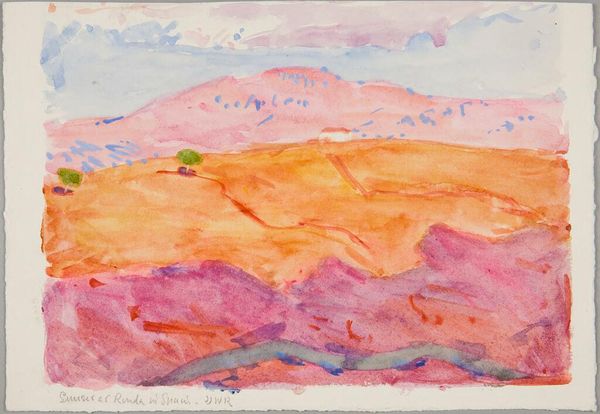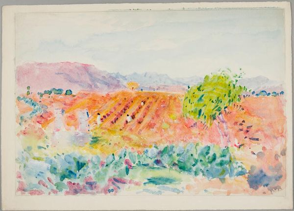 Editor: This is Robert David Gauley's "Landscape, Malaga, Spain," housed at the Harvard Art Museums. The colors are so soft, almost pastel. What do you see in the way this landscape is rendered? Curator: Look at the layering of the watercolor. The materiality suggests a rapid, almost industrial, application. How might the accessibility and affordability of this medium have influenced Gauley's process, and, in turn, the wider consumption of landscape art? Editor: That's a good point. I never considered how materials shape the art itself. Curator: Exactly. This watercolor isn't just paint; it's a reflection of the means and social context of its production. Editor: I'll definitely look at art with a new perspective now. Thanks!